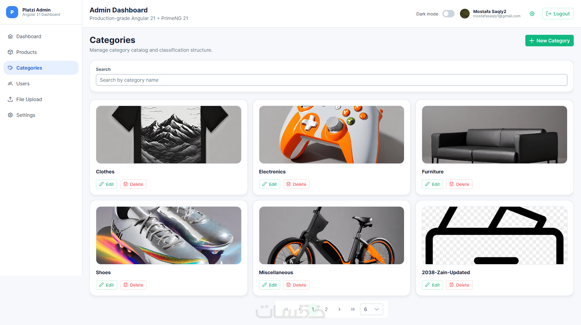 جميع الصفحات الموجودة في لوحة التحكم (Dashboard – Products – Categories – Users)