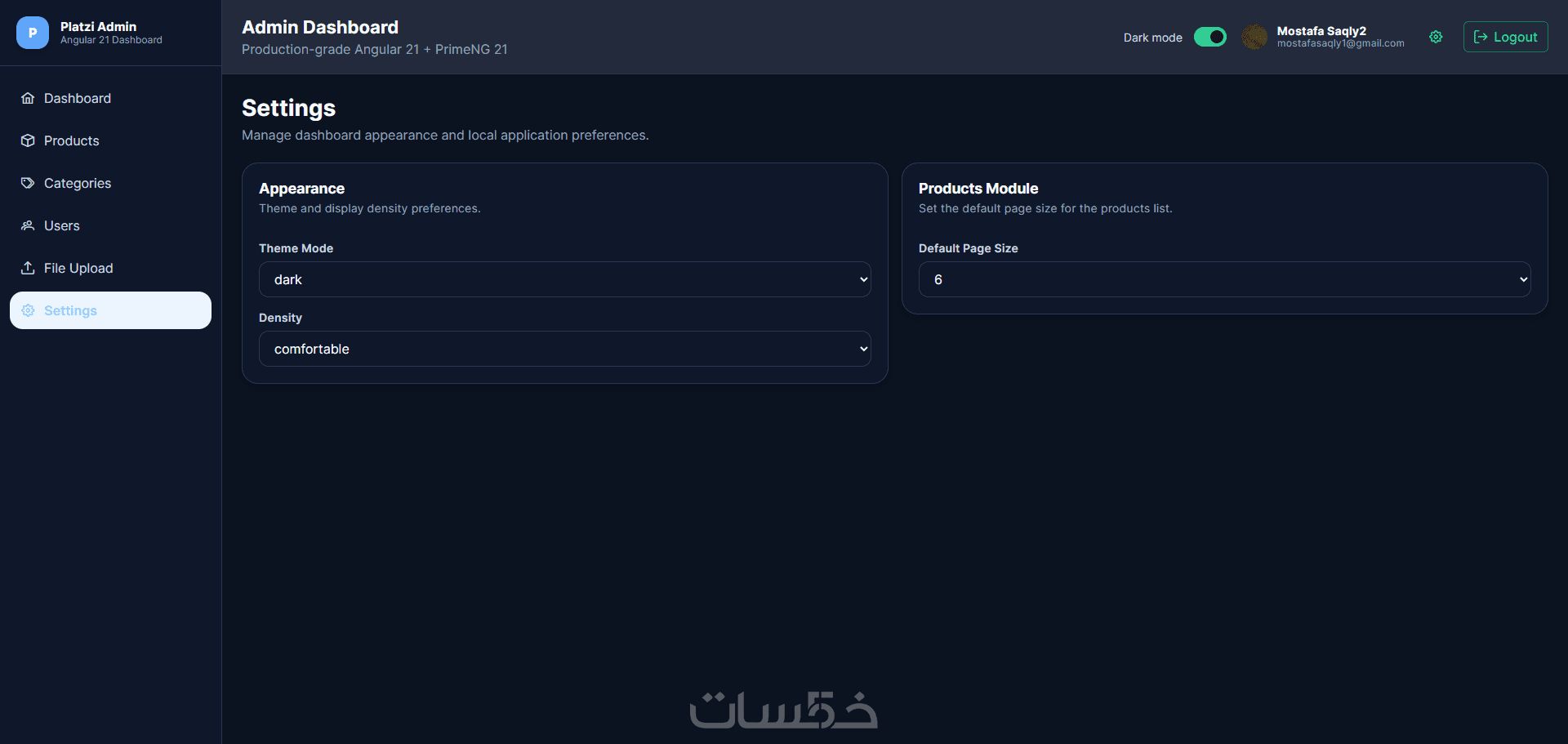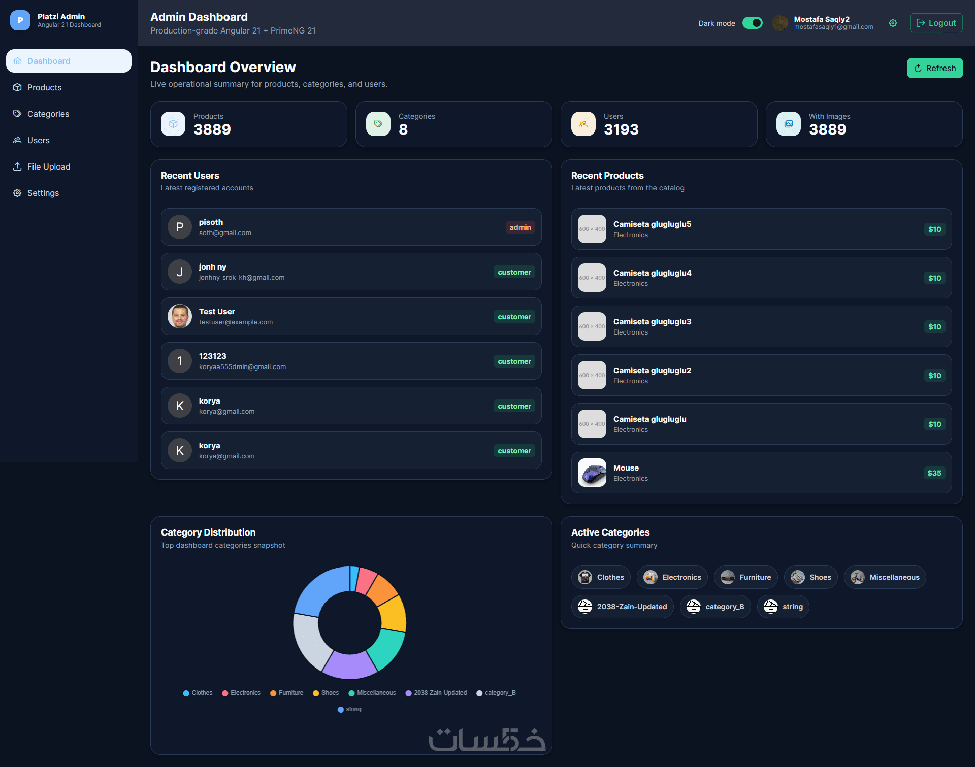 أقدم لك كود Dashboard كامل جاهز للاستخدام تم تطويره باستخدام Angular 21 و PrimeNG مع تصميم حديث وتنظيم احترافي للكود.