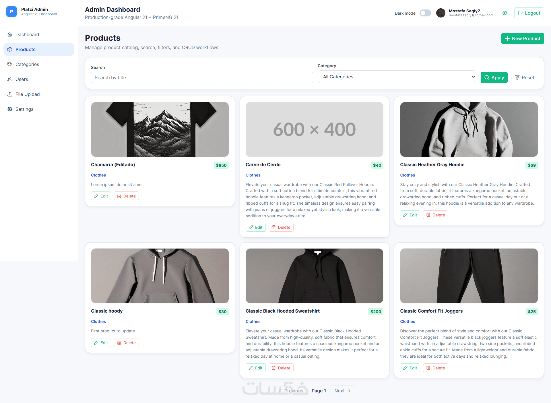 يحتوي على صفحات جاهزة (Dashboard – Products – Categories – Users)