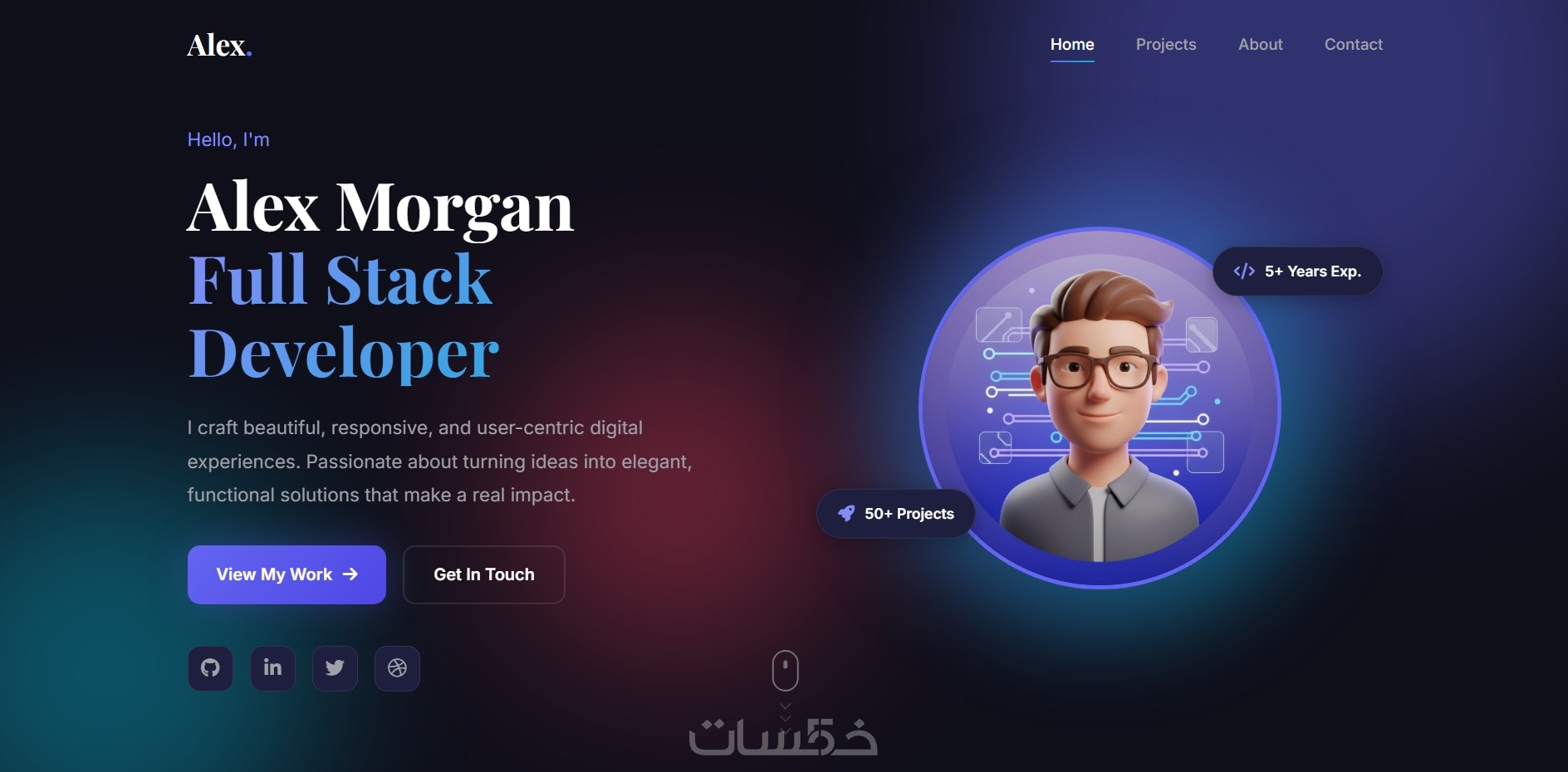 موقع Portfolio احترافي يحتوي على جميع الأقسام الأساسية مثل Home وAbout وProjects وContact.