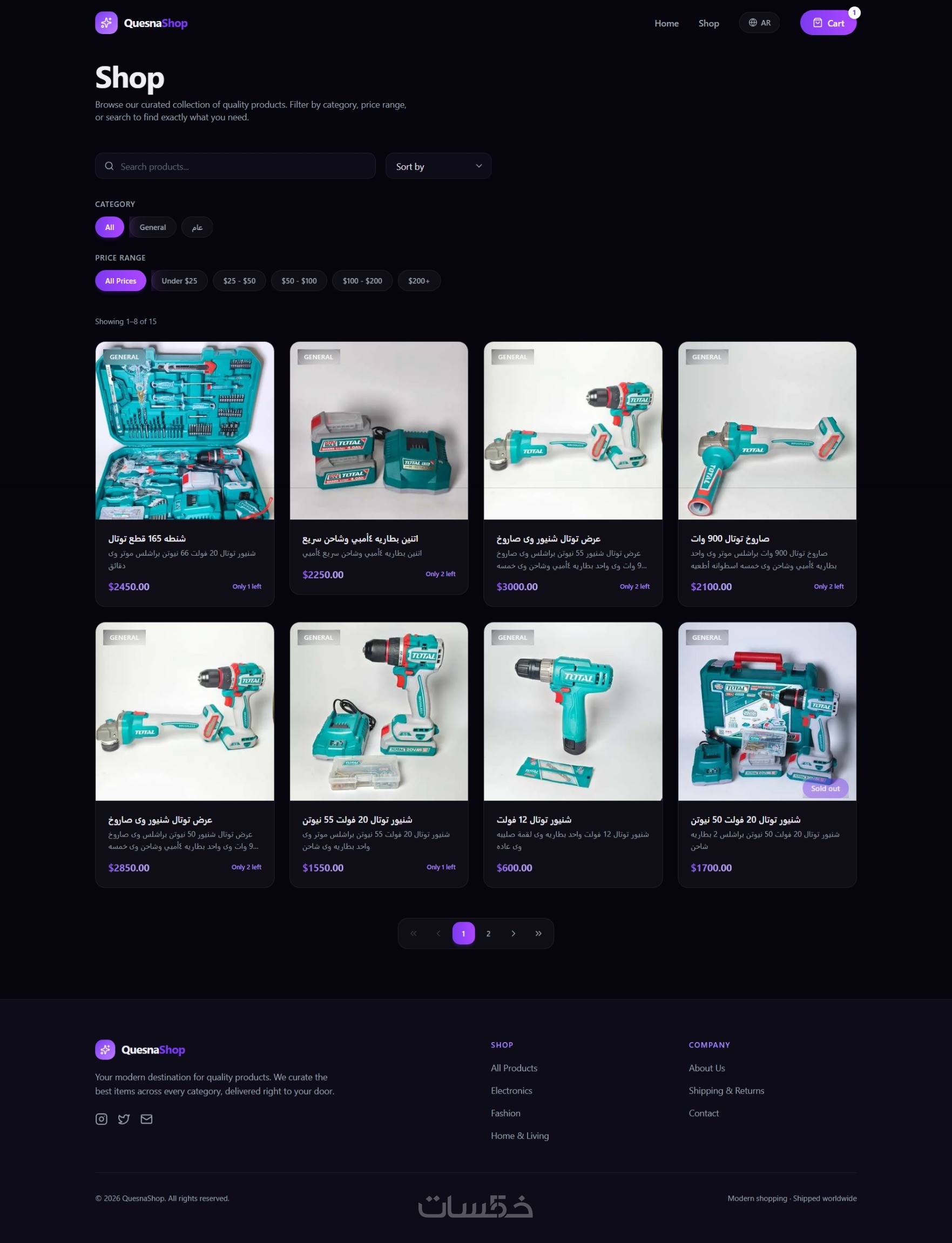 • صفحة كاتالوج: عرض كل المنتجات مع فلترة بالفئات والسعر + صفحات