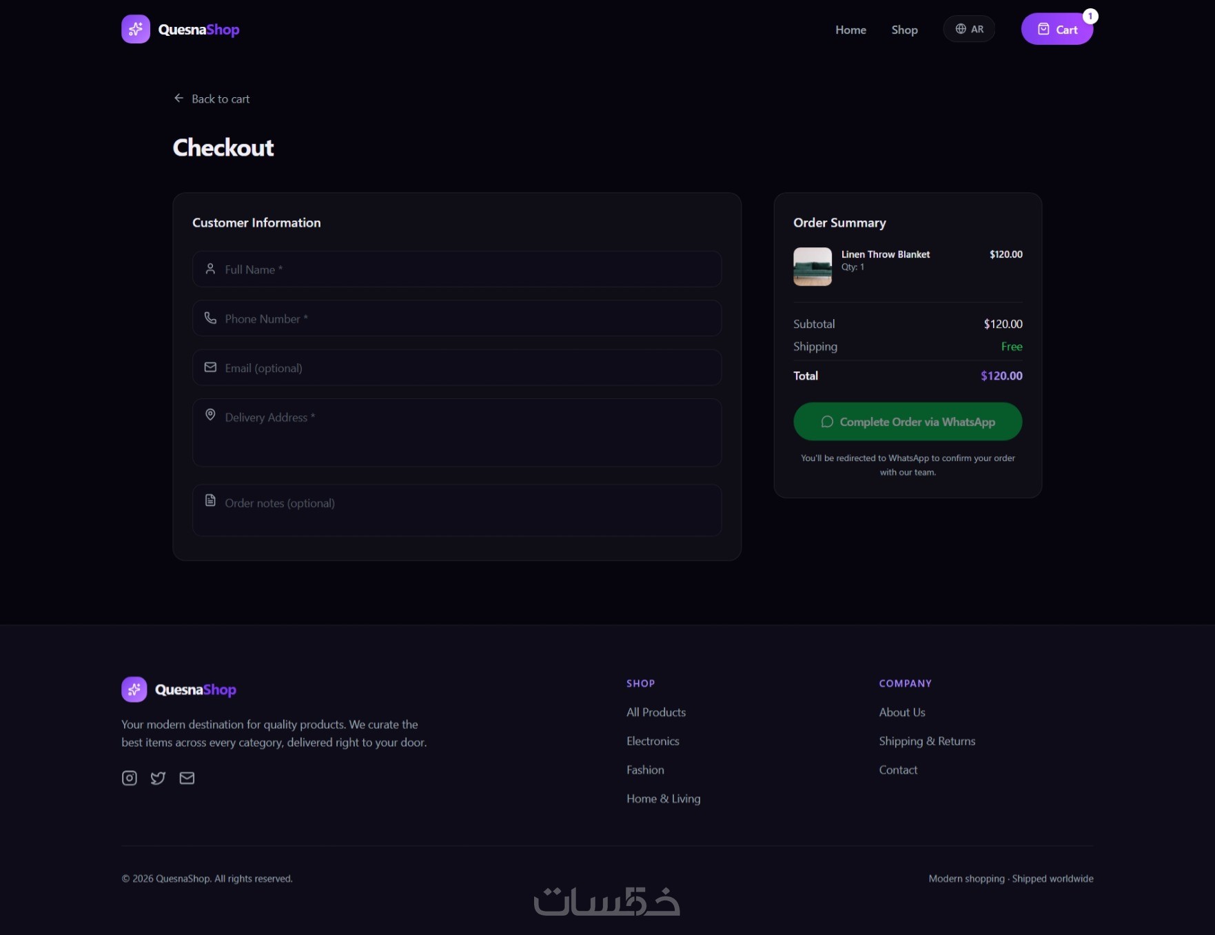 • Checkout: نموذج بيانات العميل + إرسال الطلب مباشرةً عبر WhatsApp