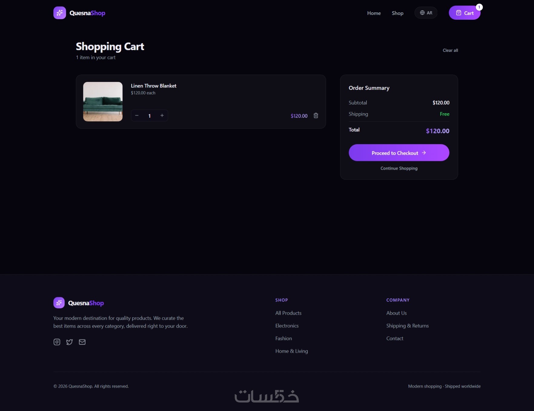 • سلة مشتريات: إضافة/حذف/تعديل الكميات + حساب الشحن تلقائيًا