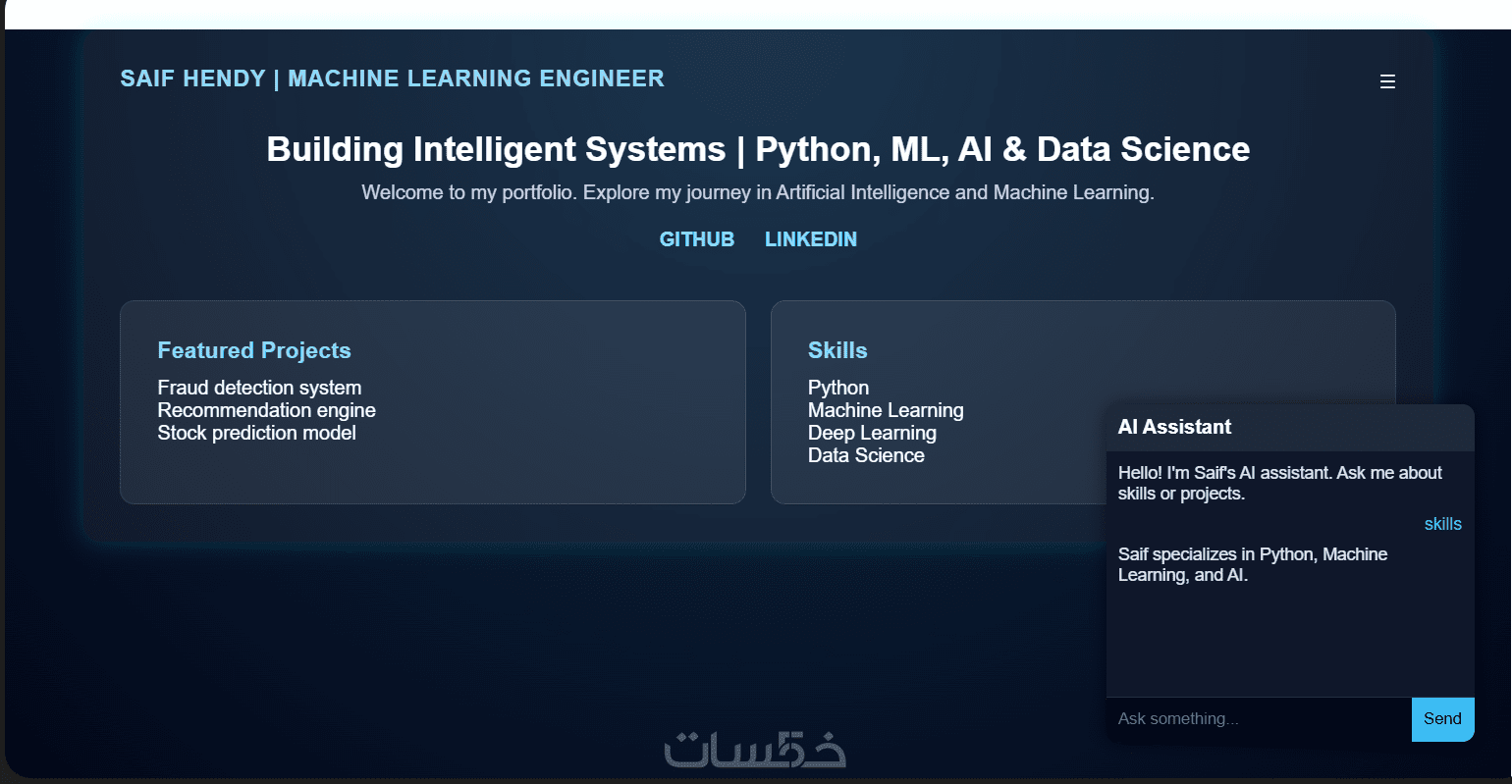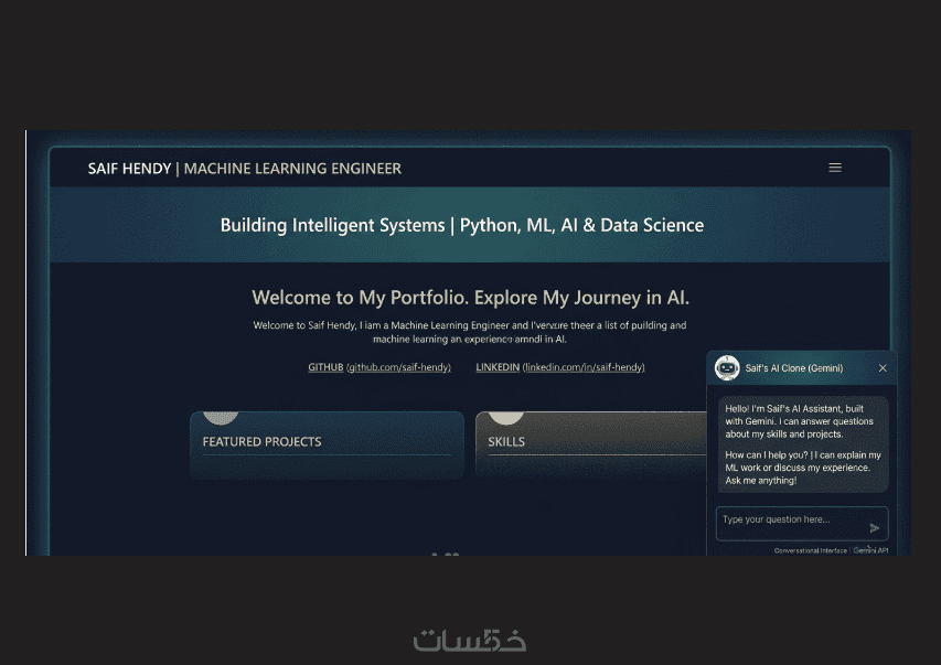 بصفتي مهندس ذكاء اصطناعي (ML Engineer) ومطور ويب، أقدم لك الحل المستقبلي: بورتفوليو تفاعلي مزود بمساعد ذكي (AI Clone) مخصص لك بالكامل.