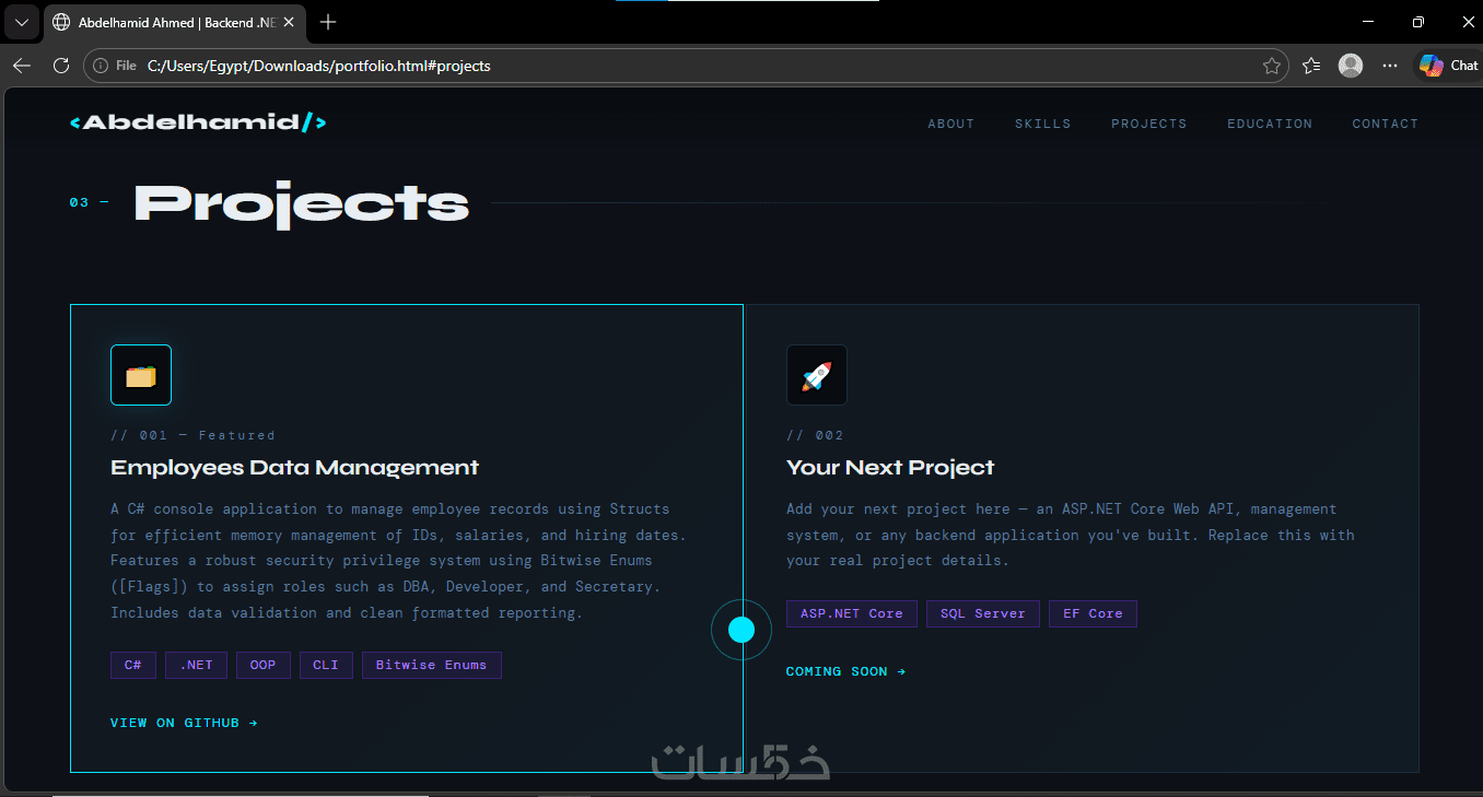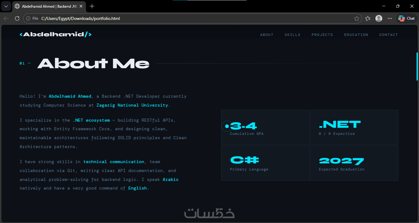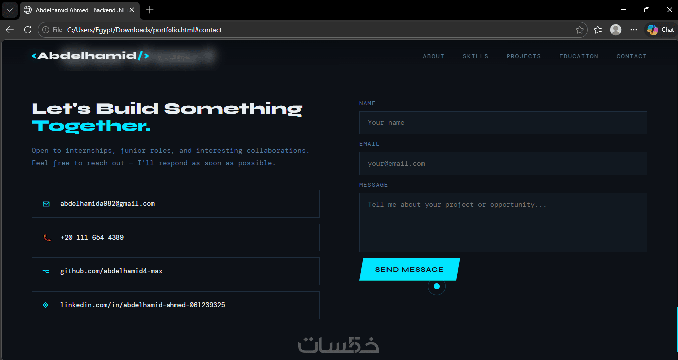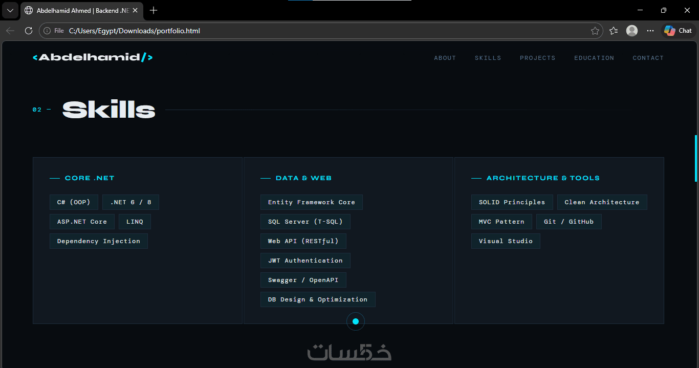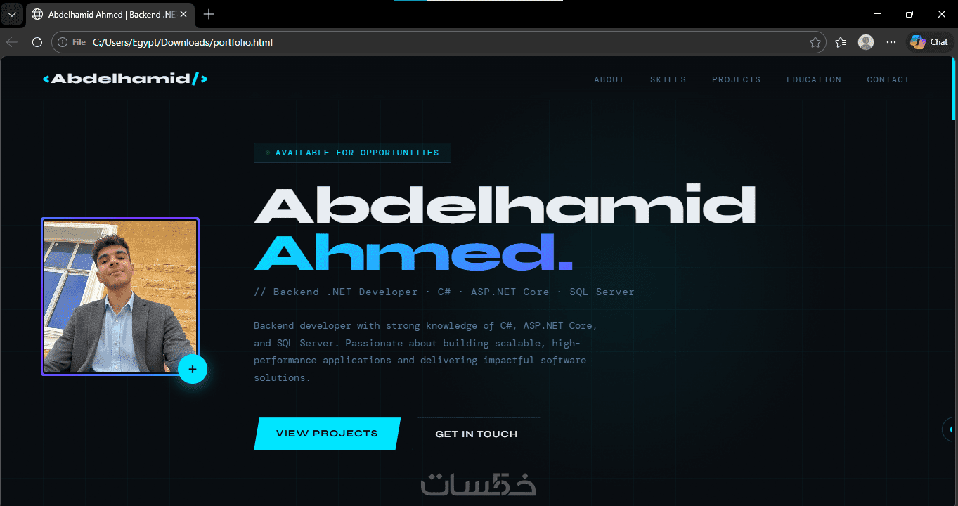 معك عبد الحميد أحمد، مطور Full Stack Developer، أقدم خدمة إنشاء بروفايل احترافي يساعدك على عرض مهاراتك وخبراتك بشكل منظم وجذاب، بطريقة احترافية تناسب التقديم للوظائف أو العمل الحر.