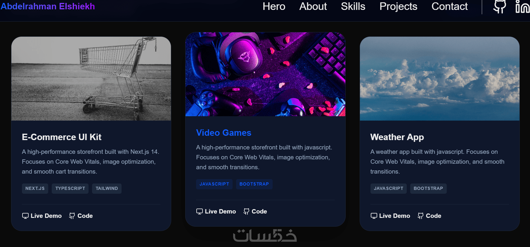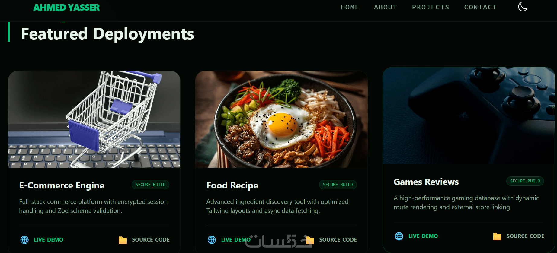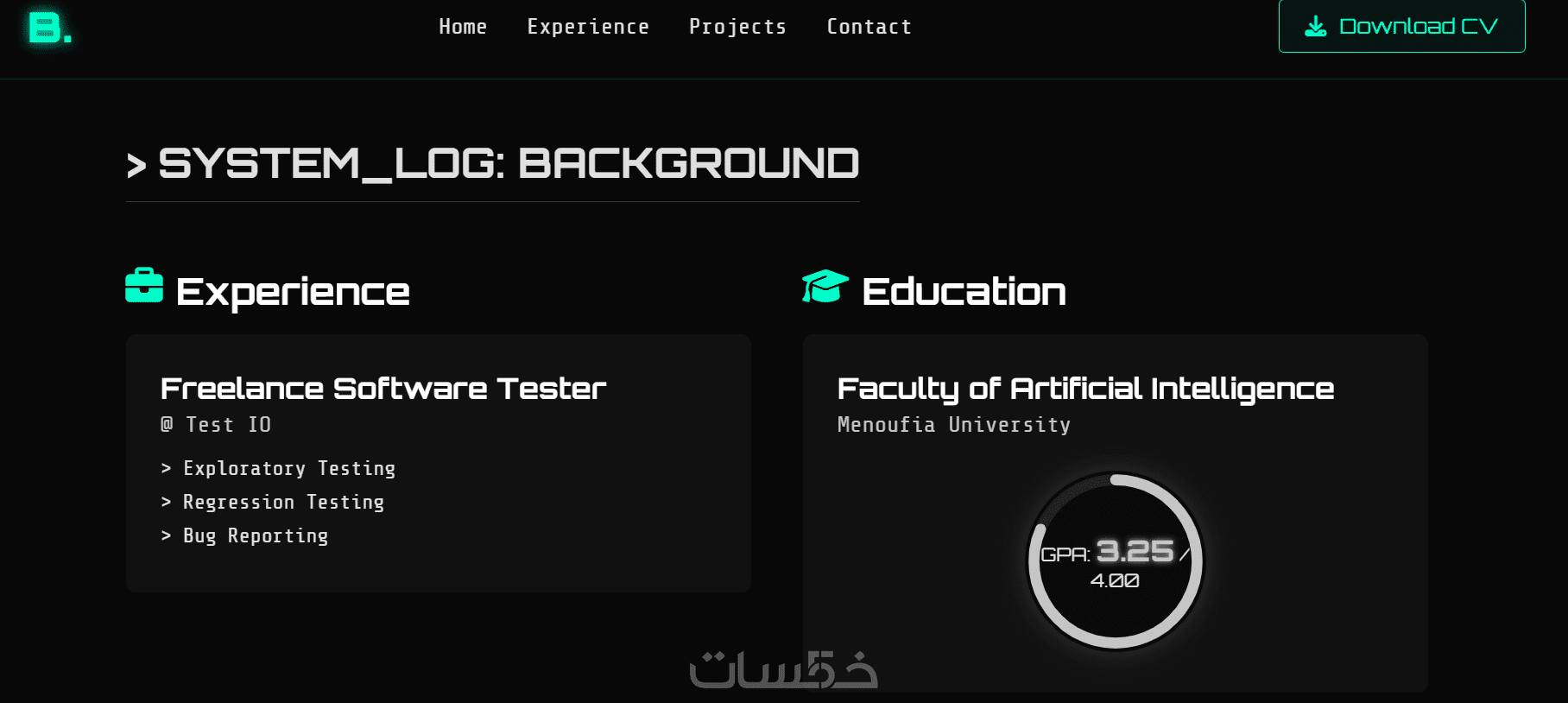 عدد الصفحات: موقع متكامل بـ 4 صفحات (الرئيسية، من أنا، المشاريع، اتصل بي).