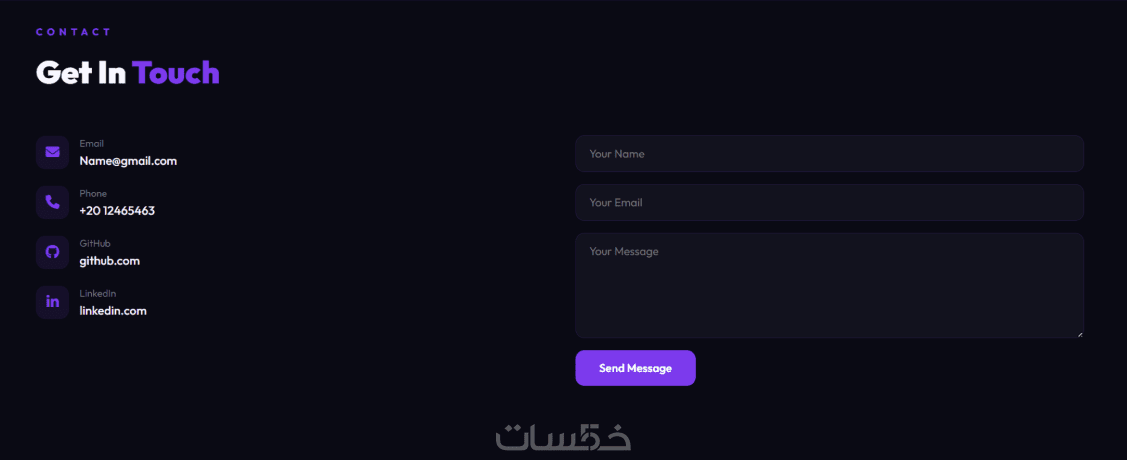 اتصل بنا (Contact): نموذج تواصل مباشر مع ربط حسابات التواصل الاجتماعي.