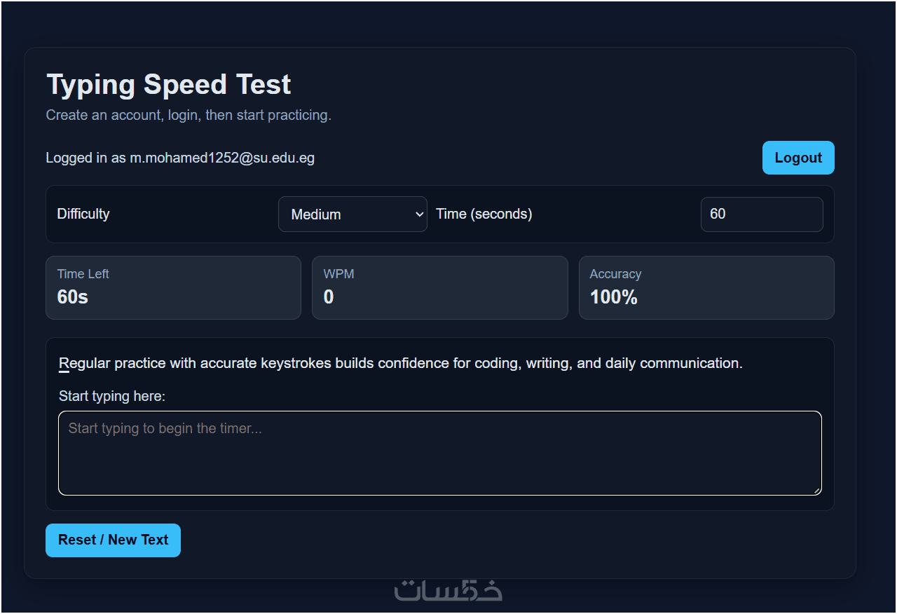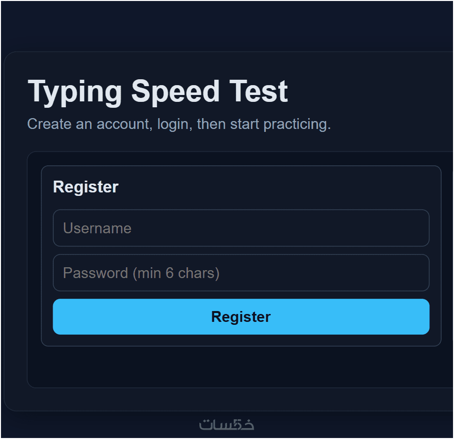 اختبار سرعة الكتابة بتصميم عصري وأداء فائق. التطبيق ليس مجرد صفحة بسيطة، بل منصة تحتوي على نظام تسجيل مستخدمين وقاعدة بيانات لحفظ وتتبع سجل النتائج، مما يجعله مثالياً للمؤسسات التعليمية أو كفكرة مشروع تقني مميز.
