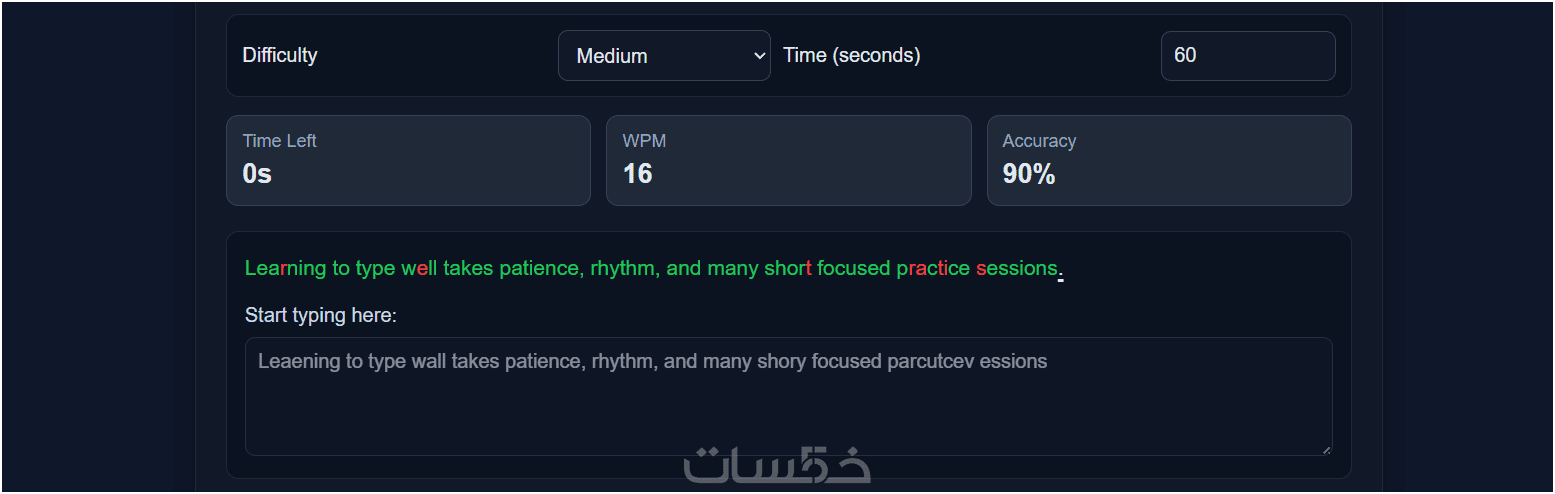 حساب الكلمات في الدقيقة (WPM) ونسبة الدقة (Accuracy) واكتشاف الأخطاء اللحظي.