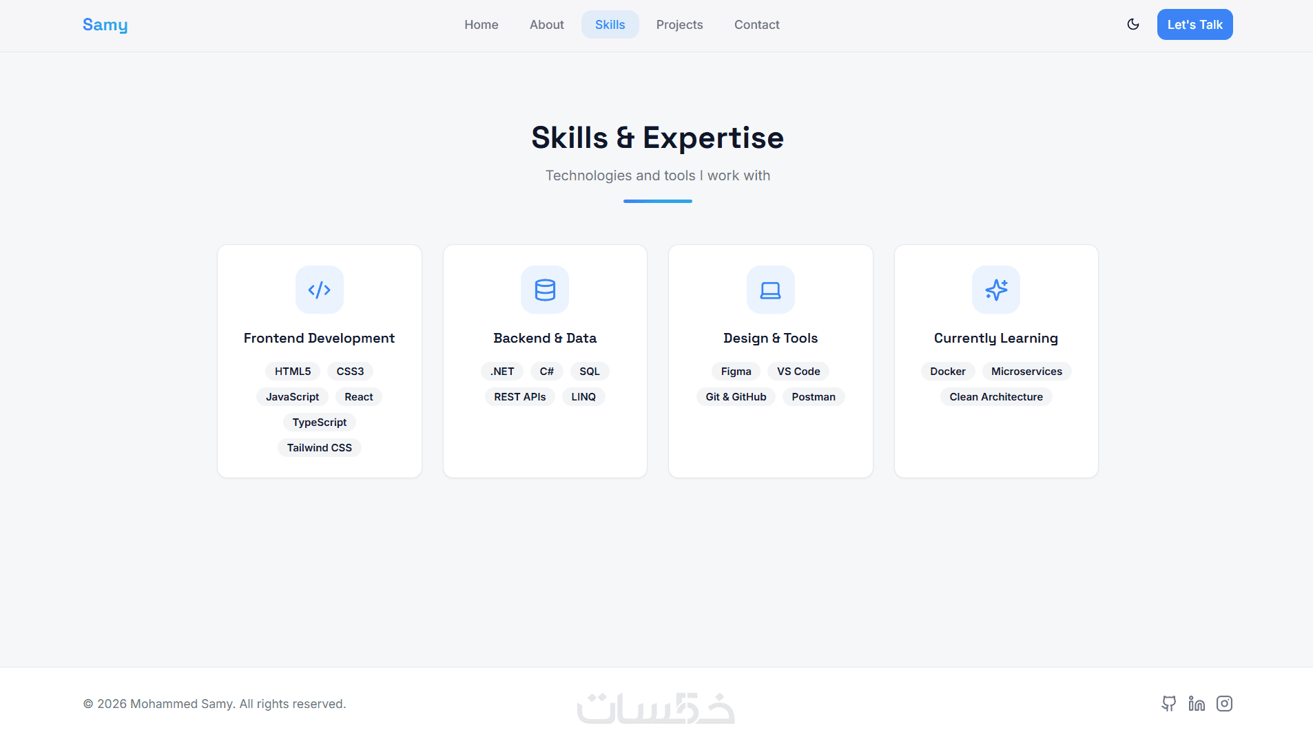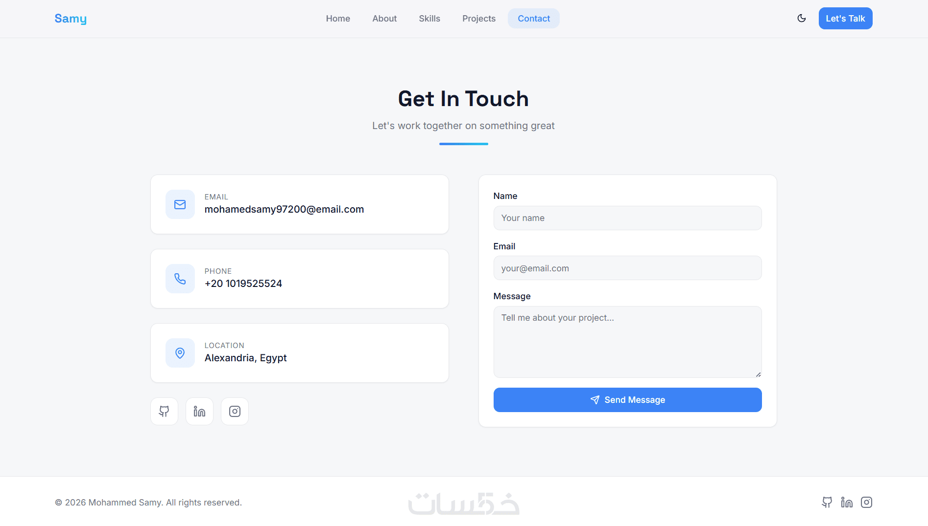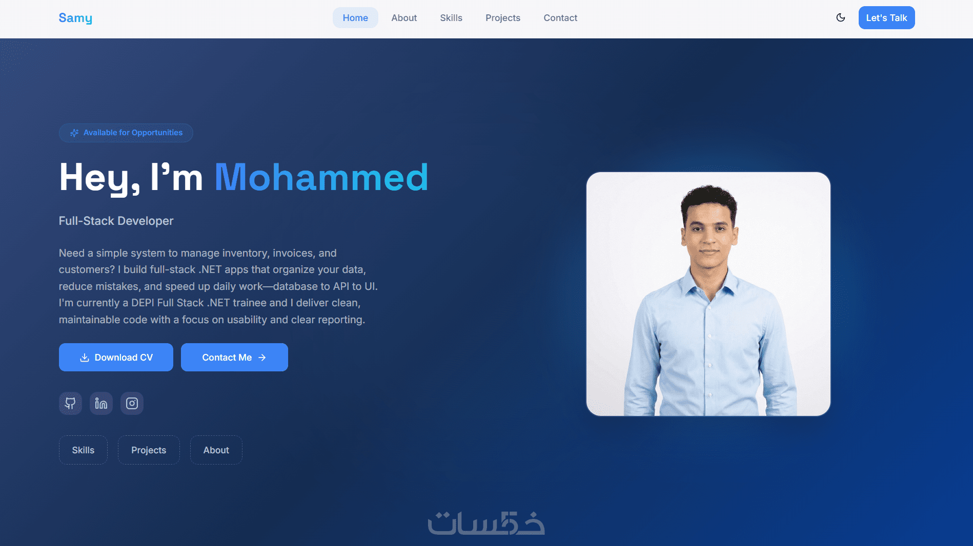 موقع شخصي (Portfolio) كامل وجاهز للرفع على الإنترنت (على منصات مثل Netlify أو Vercel أو GitHub Pages).