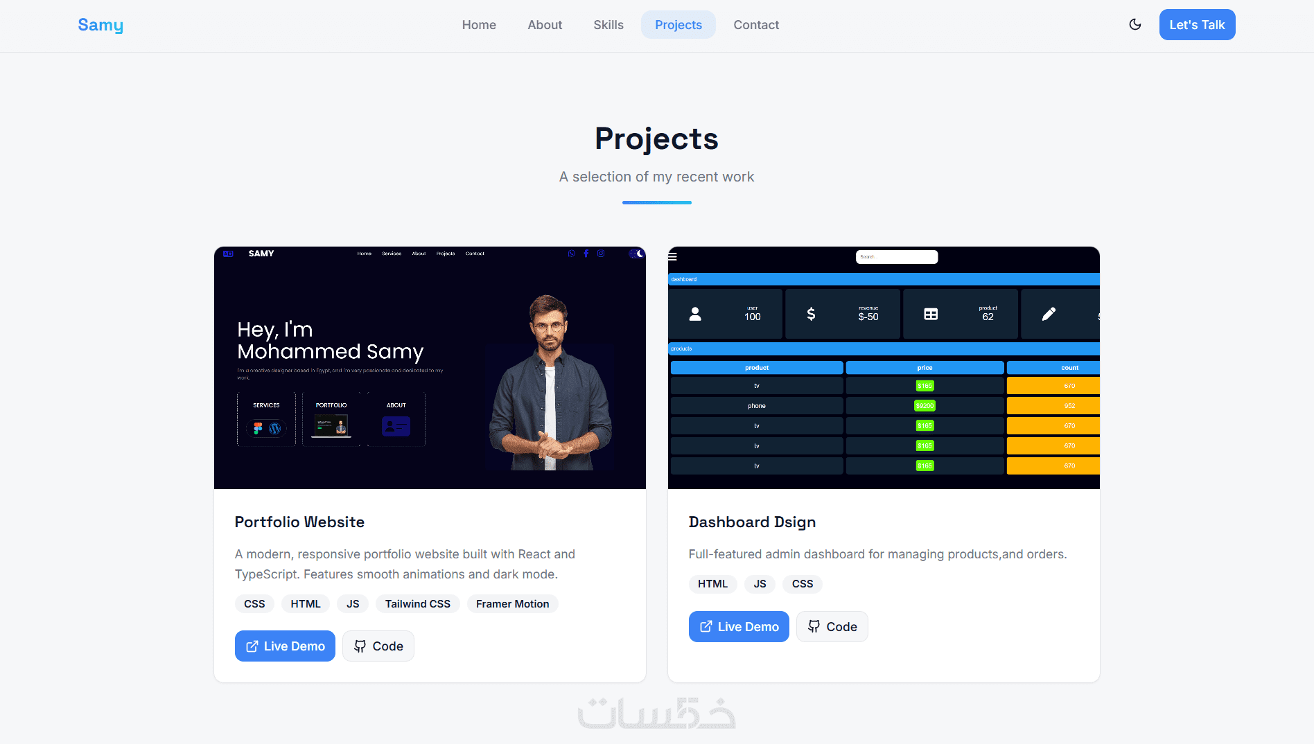 قسم خاص لمشاريعك (Projects) يشمل تفاصيل كل مشروع، صورته، وروابط المعاينة الحية (Live Demo) وكود المشروع (GitHub).