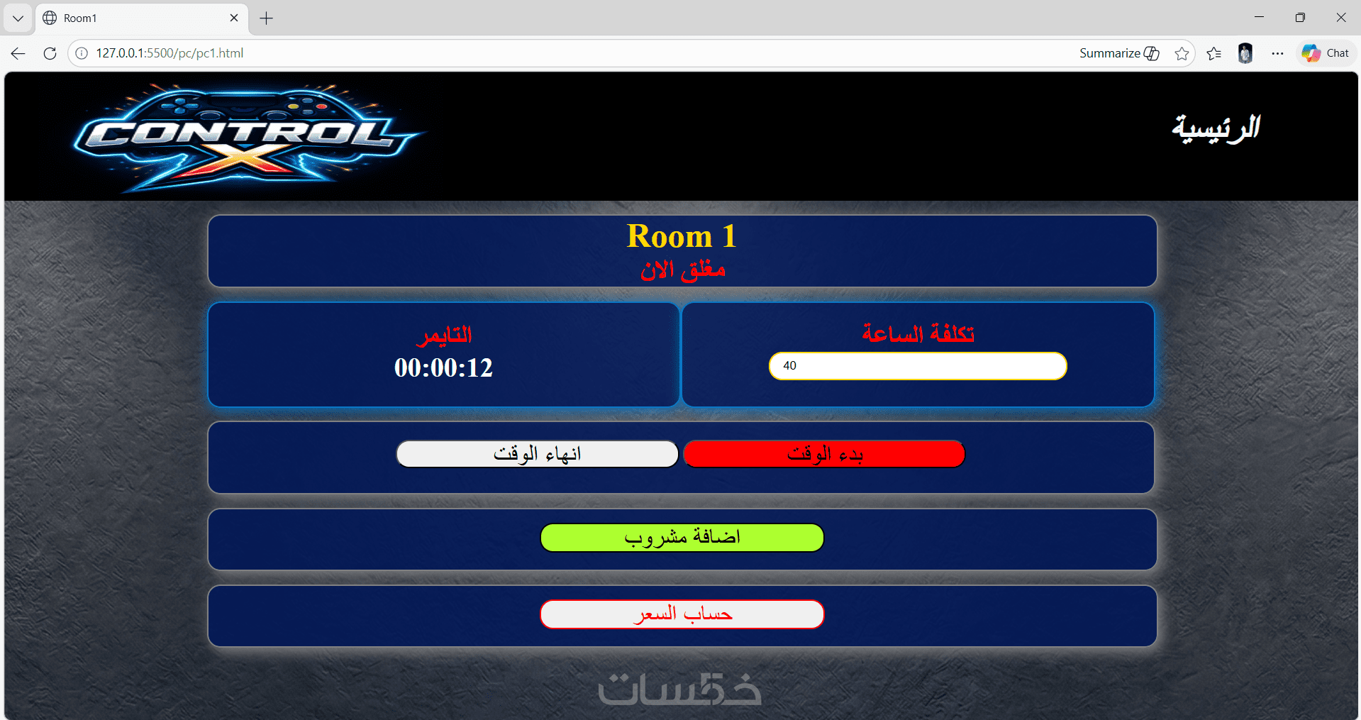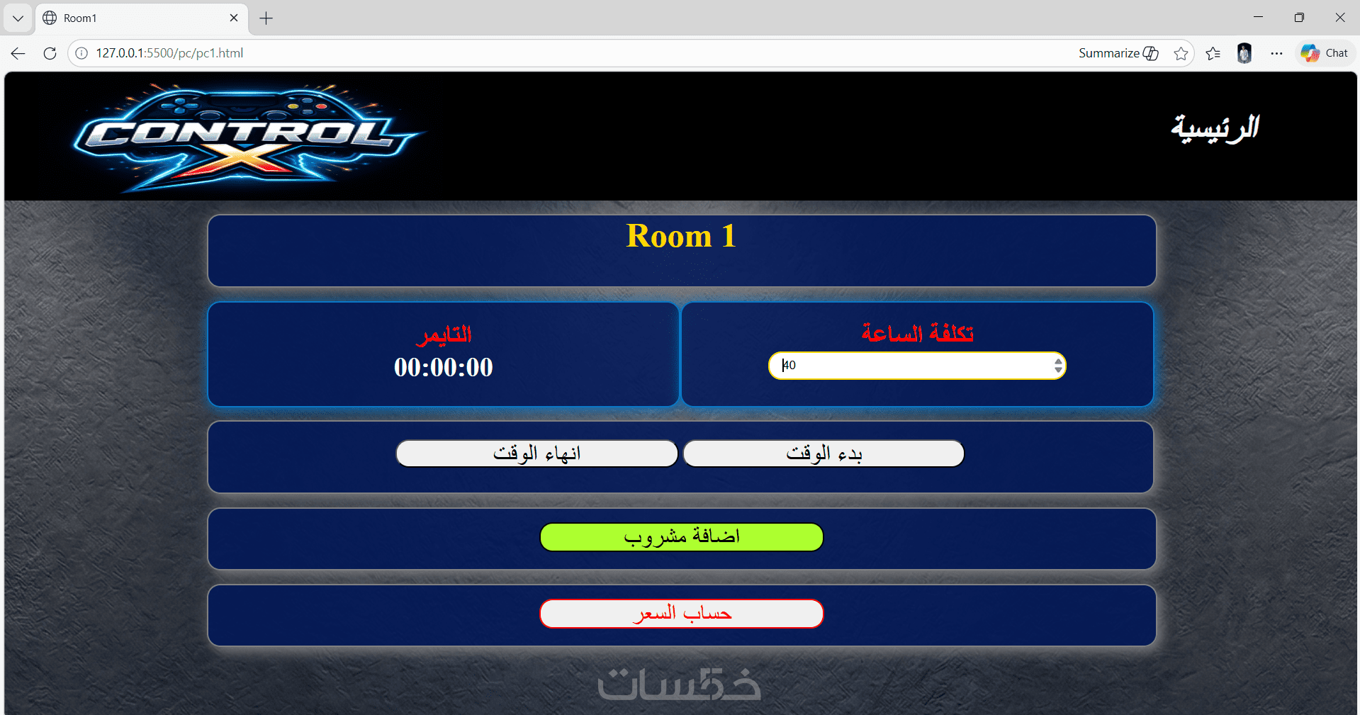 تقدر تضيف كل جهاز في المحل وتحدد سعر الساعة بتاعه. أول ما تشغل الجهاز هيتسجل وقت البداية تلقائي، ولما توقفه هيتسجل وقت النهاية، والصفحة هتحسب المدة اللي اتلعبت وتطلع السعر بناءً على سعر الساعة.