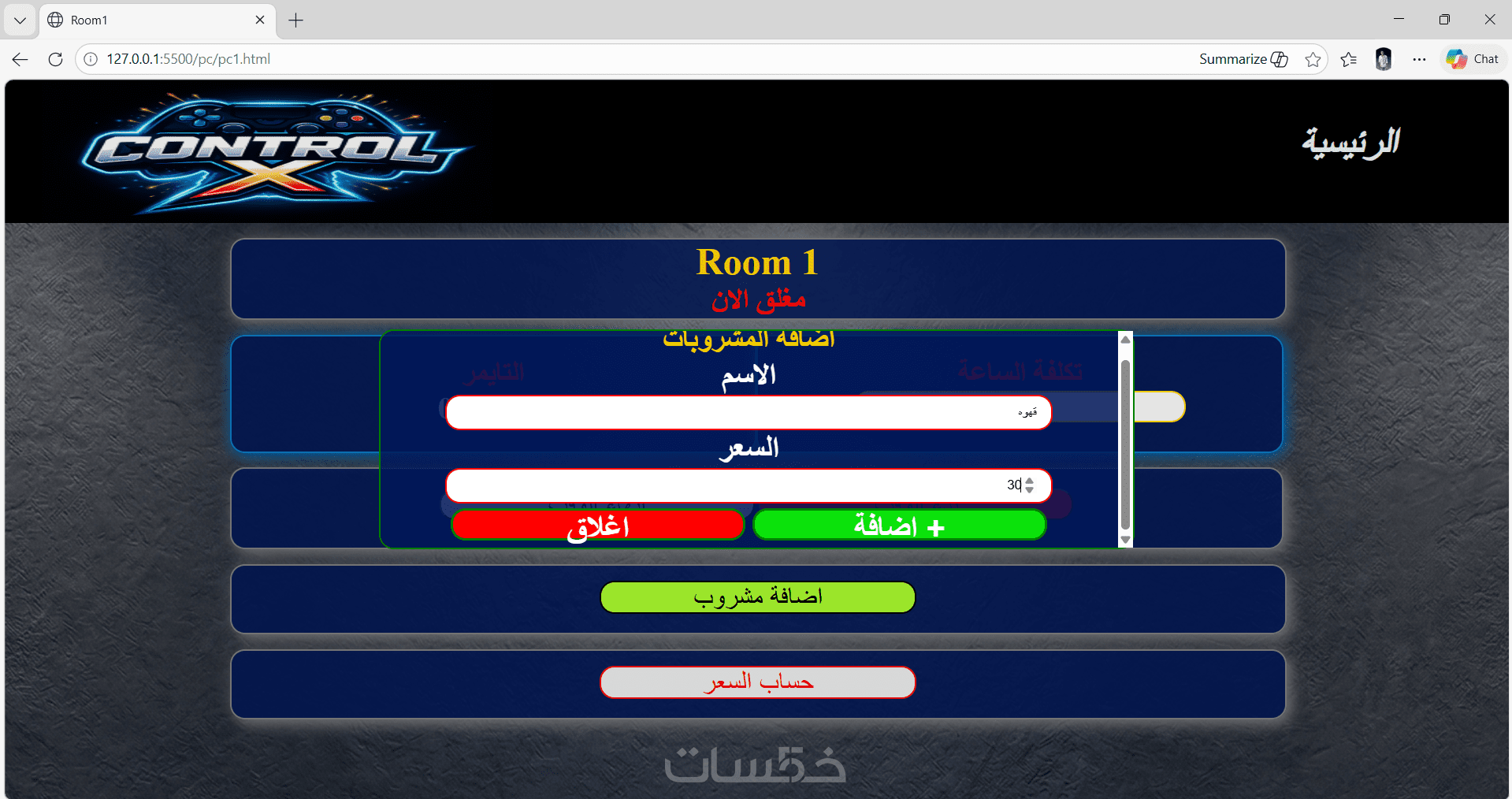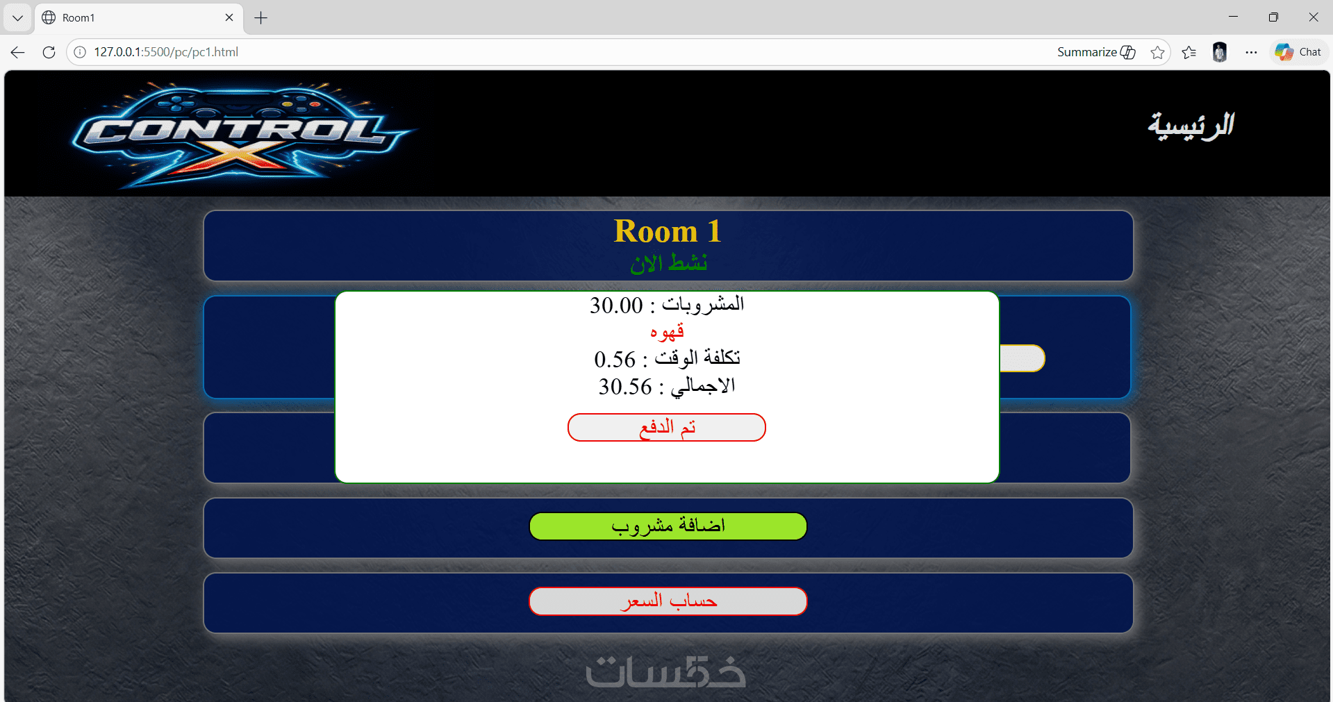 كمان تقدر تضيف المشروبات اللي اتطلبت أثناء اللعب، وسعرها هيتجمع مع تكلفة الوقت ويظهرلك الإجمالي النهائي.