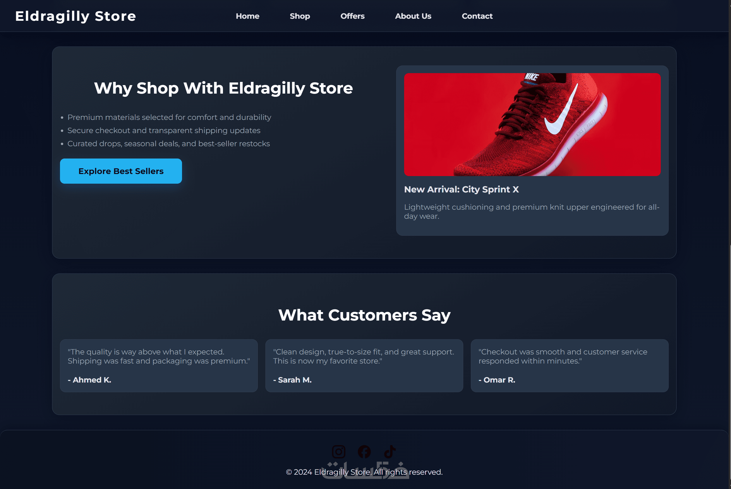 يحتوي المتجر على صفحات متعددة مثل الصفحة الرئيسية، المنتجات، العروض، من نحن، والتواصل، مع تصميم متجاوب يعمل بكفاءة على جميع الأجهزة.
