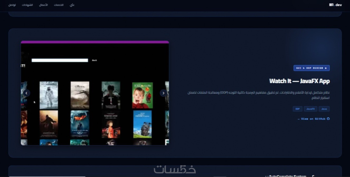 القسم الأهم! عرض مشاريعك السابقة مع "معرض صور متحرك" (Custom Slider) تفاعلي وسلس لكل مشروع، وروابط مباشرة لأعمالك.