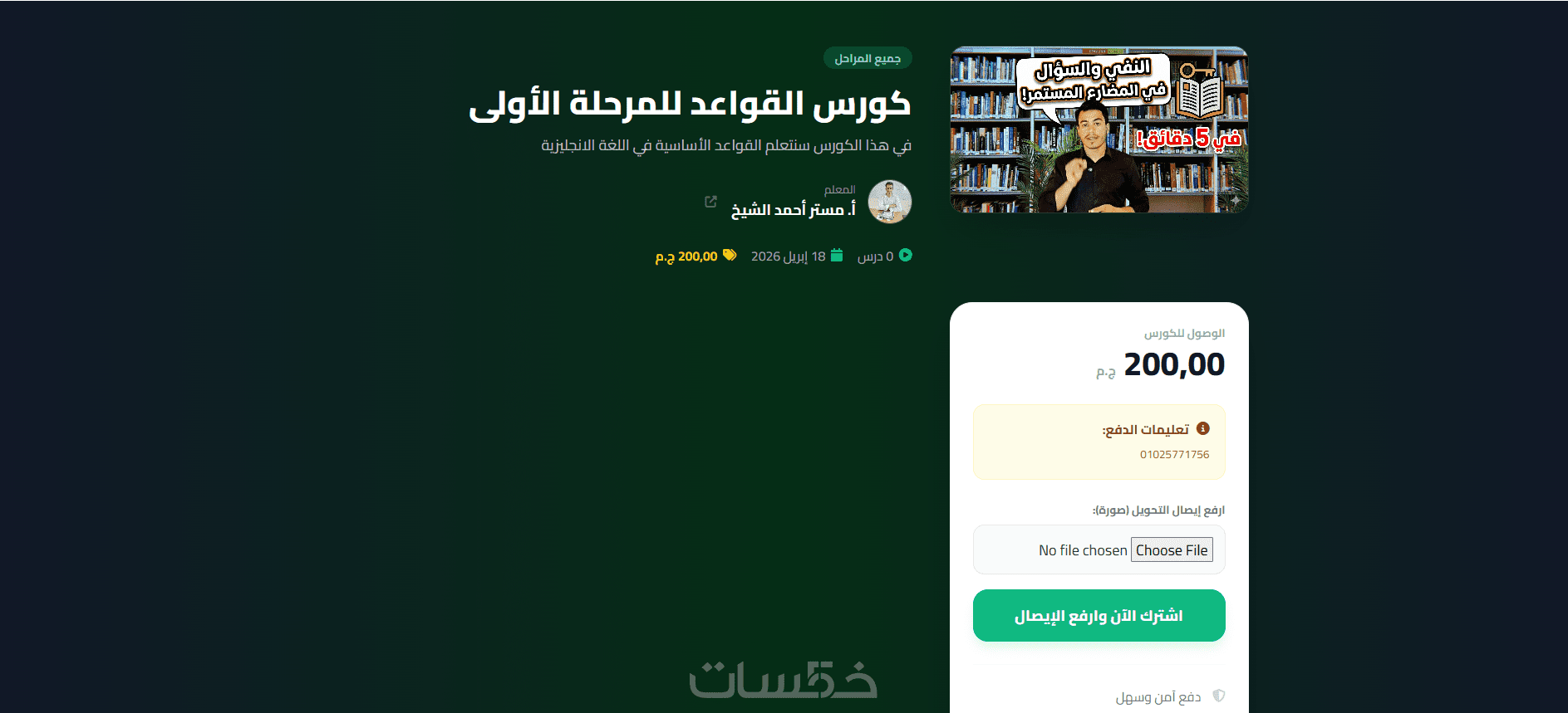 تفعيل خيار الدفع بالطرق المحلية (مثل فودافون كاش، المحافظ الإلكترونية، أو التحويل البنكي). يقوم الطالب برفع "صورة الإيصال" ليتم مراجعته وتفعيل الكورس له بكل سهولة وأمان.