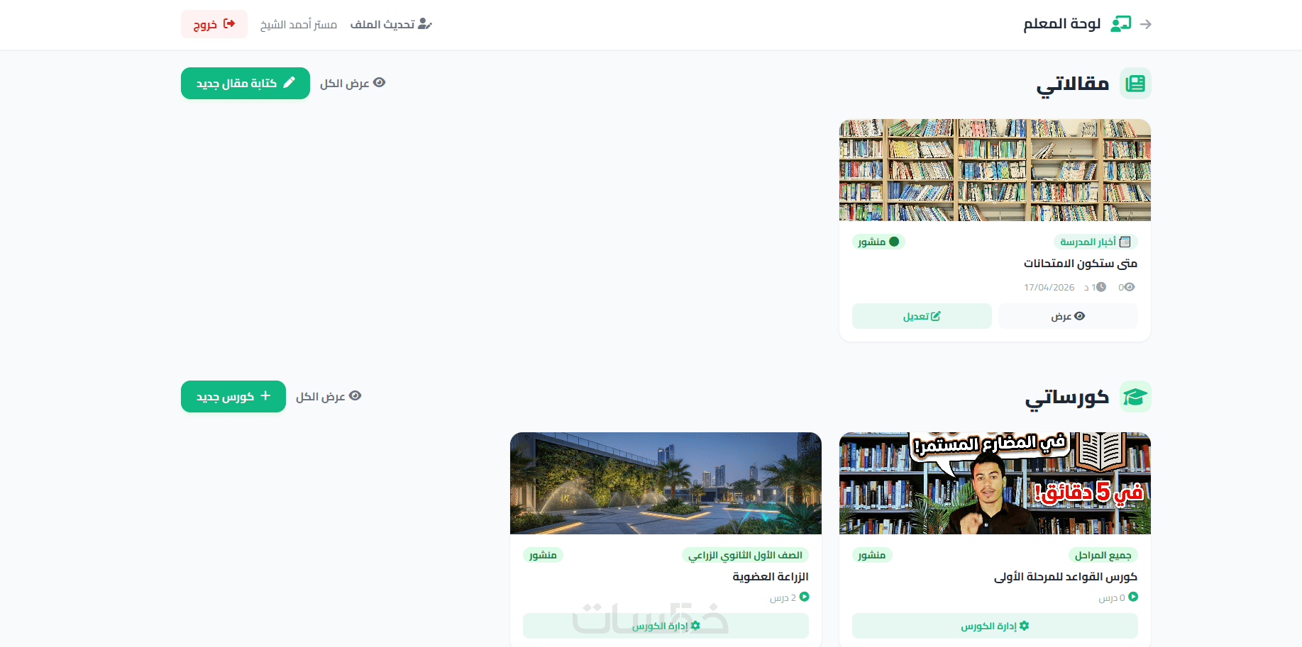 لوحة تحكم مستقلة لكل معلم لإضافة دوراته، ومتابعة مبيعاته، والتواصل مع طلابه.