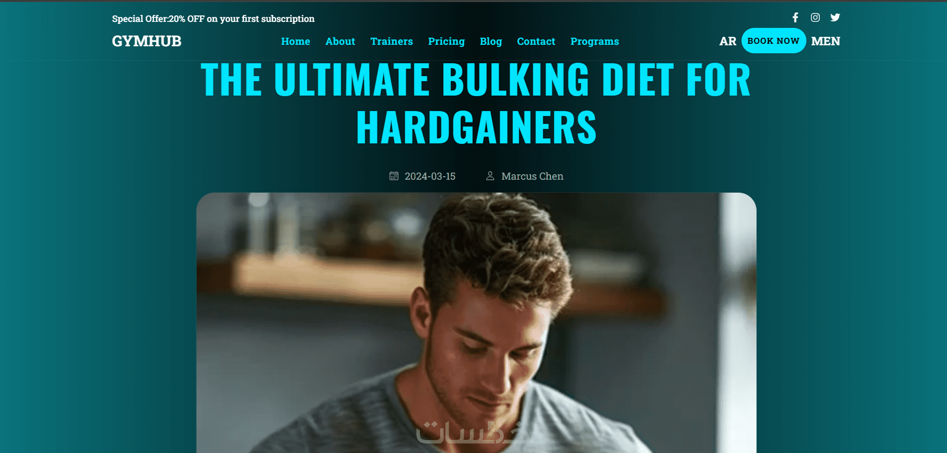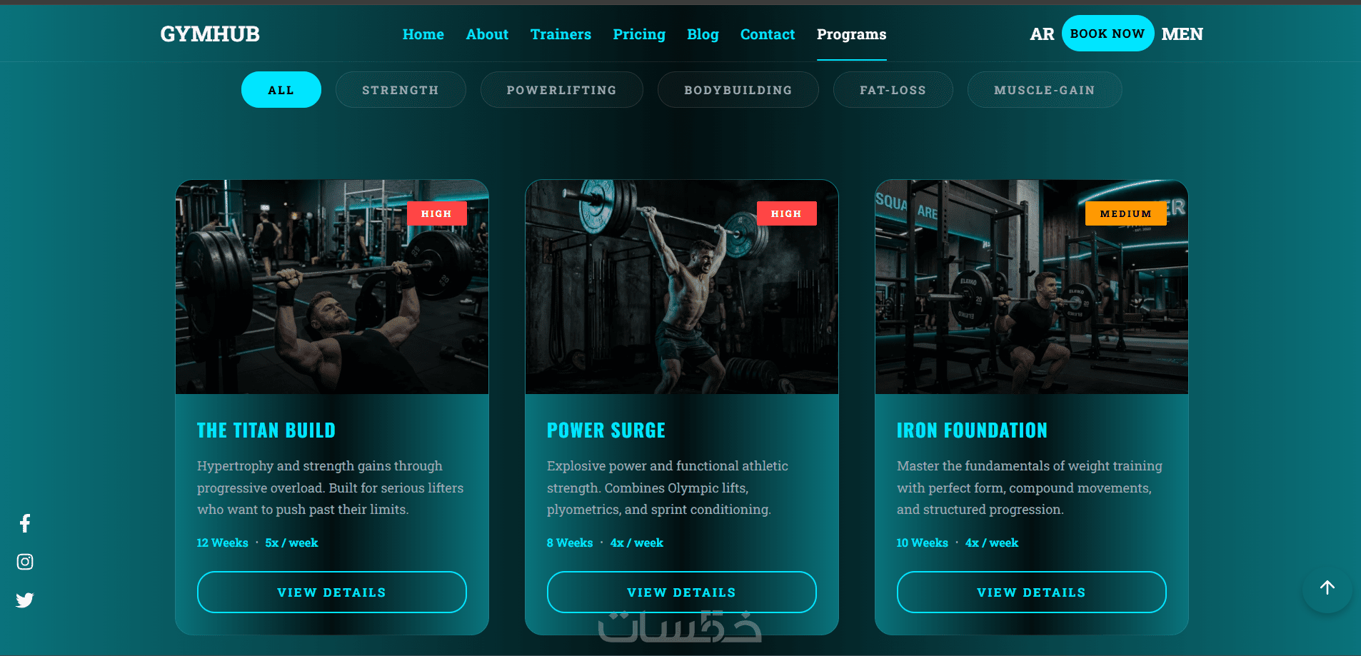 موقع احترافي لنادي جيم مصمم لمساعدتك على إدارة الاشتراكات، عرض الباقات، وحجز التمارين بسهولة عبر الإنترنت. يتميز بتصميم عصري يعكس روح القوة والطاقة، مع تجربة استخدام سلسة على جميع الأجهزة.
