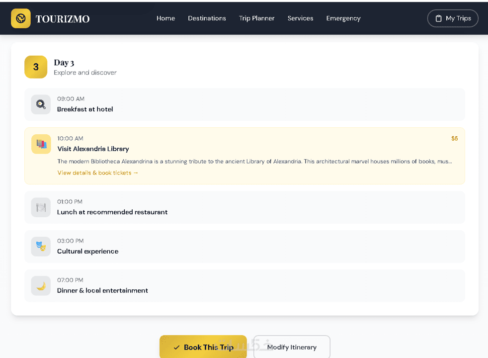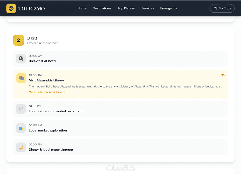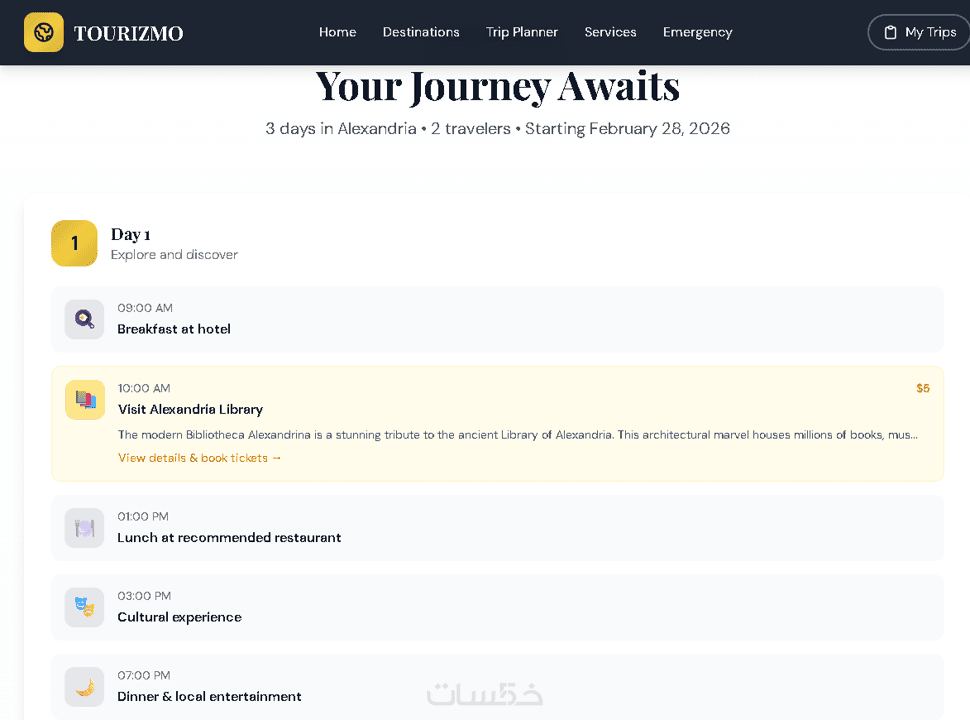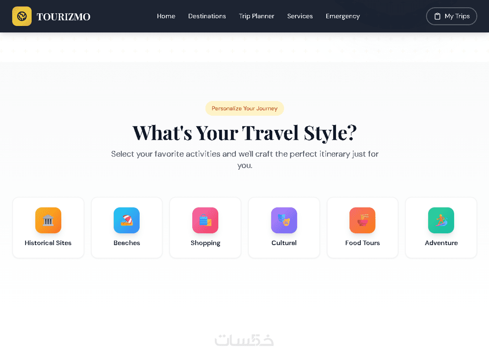 مخطط الرحلات الذكي (Trip Planner): إضافة برمجة تفاعلية تتيح للزائر إدخال ميزانيته، مدة إقامته، وعدد الأفراد، ليقوم الموقع بتوليد جدول رحلة تفاعلي.