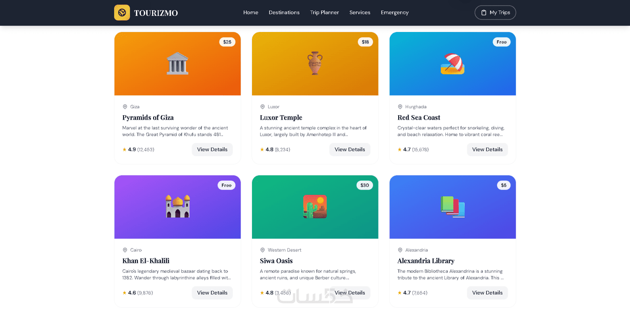 تصميم عصري: واجهة جذابة تعتمد على أسلوب (Glassmorphism) مع حركات تفاعلية (Animations) وتدرجات لونية مريحة تعكس فخامة الخدمات السياحية.