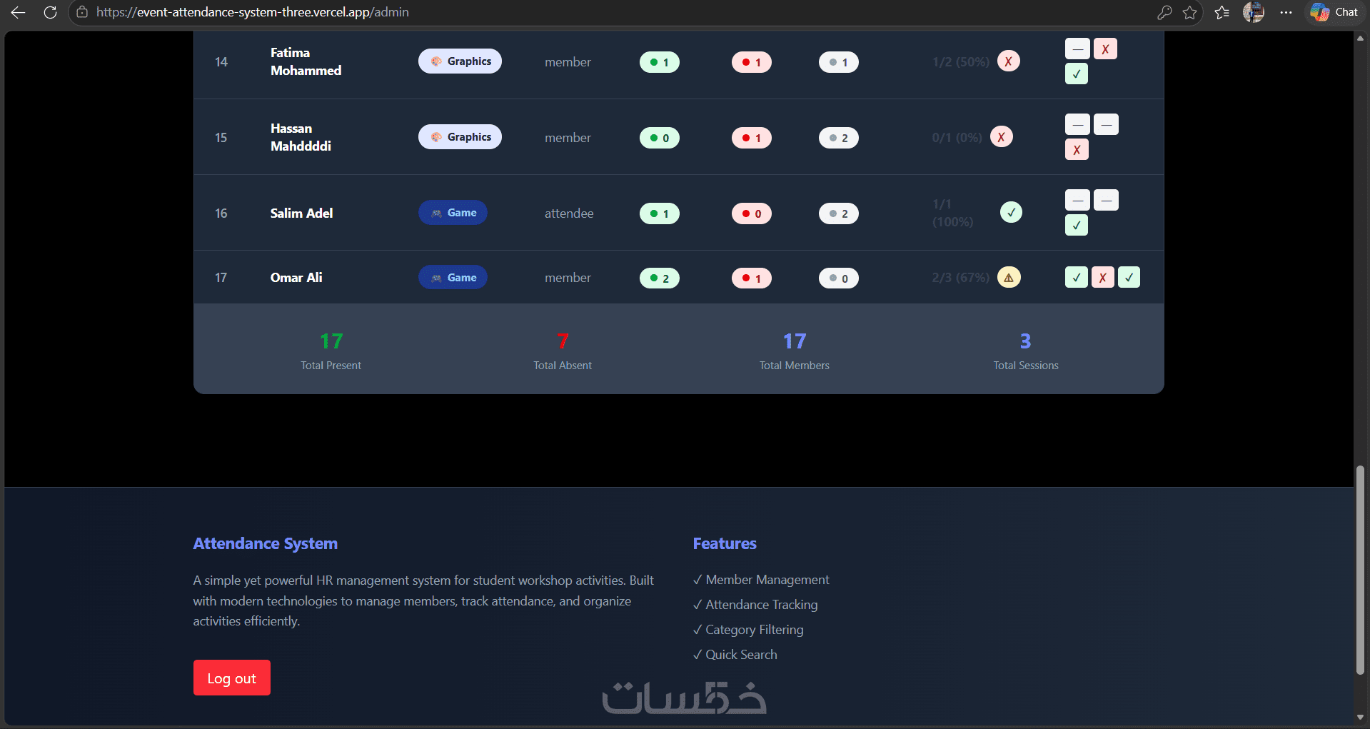 أقدم لك نظام إدارة حضور الفعاليات Events Attendance Management System، وهو حل برمجي متكامل وموثوق صُمم خصيصاً لتسهيل إدارة الأعضاء والجلسات بسلاسة واحترافية. سواء كنت تدير نادياً طلابياً، مؤسسة تدريبية، أو تنظم مؤتمرات دورية، هذا النظام سيمنحك تحكماً كاملاً ورؤية واضحة لمستوى التفاعل في فعالياتك.