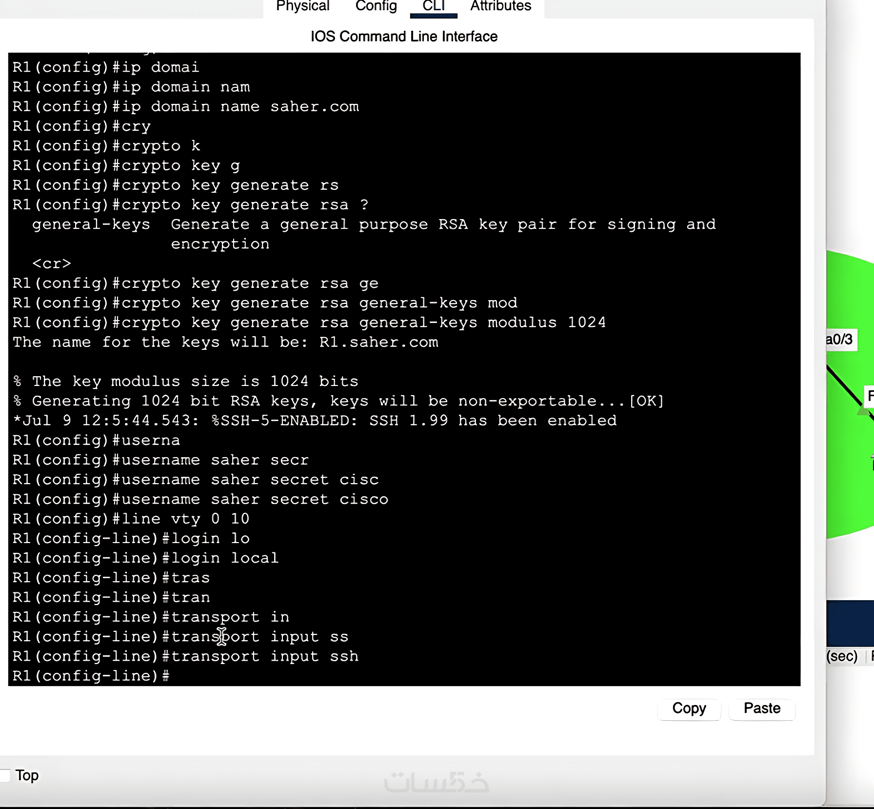 تأمين الوصول (SSH & AAA): إعداد بروتوكولات AAA (Authentication, Authorization, Accounting) لضمان دخول الأشخاص المصرح لهم فقط، مع تشفير كلمات المرور وتفعيل الـ SSH بدلاً من Telnet.