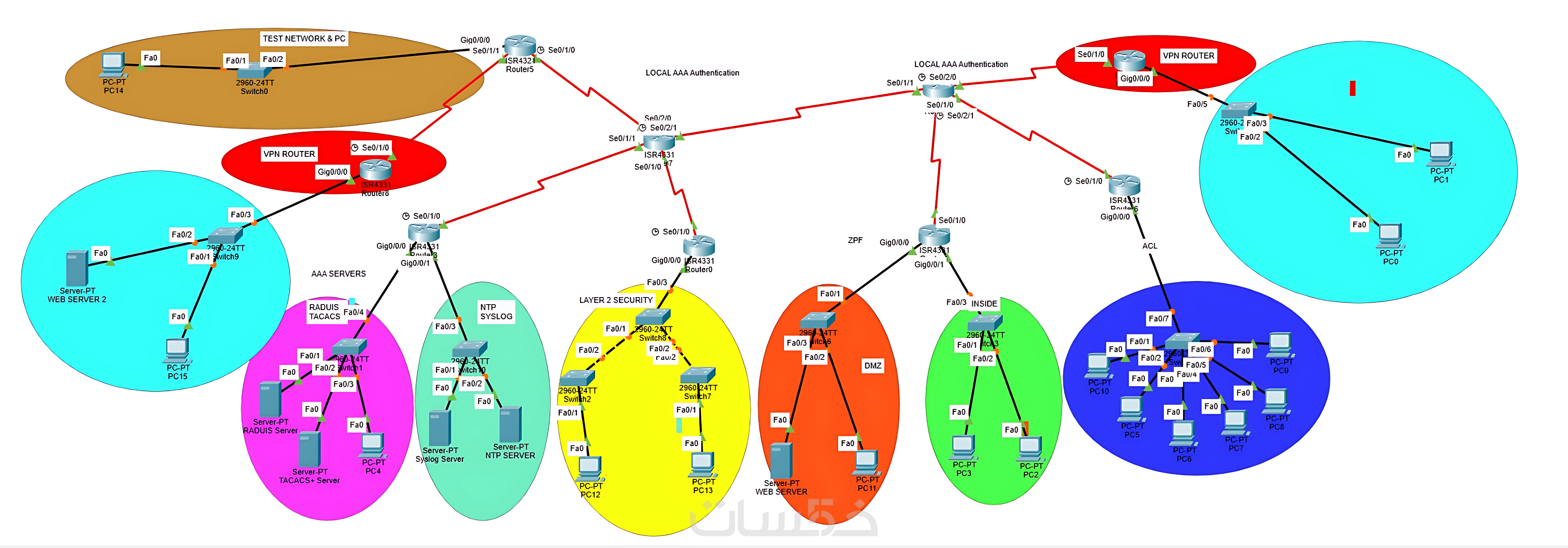 جدران الحماية (ACLs & ZPF): بناء قواعد تحكم (Access Control Lists) وفيروال (Zone-Based Policy Firewall) لمنع حركة المرور المشبوهة بين أقسام الشركة.