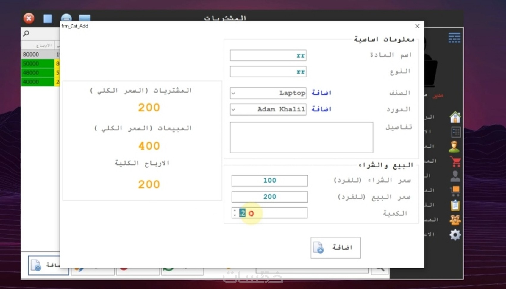 ٤- شاشة المشتريات لي اضافة المنتجات اللتي اشتريتها بي كل معلوماتها (اسم/كود المنتج - نوع المنتج - وصف المنتج - سعر الشراء - سعر البيع - الكمية) ويتم حساب سعر البيع بي البرنامج بدون تدخل منك وفي اعلي الصفحة سعر جميع مشترياتك