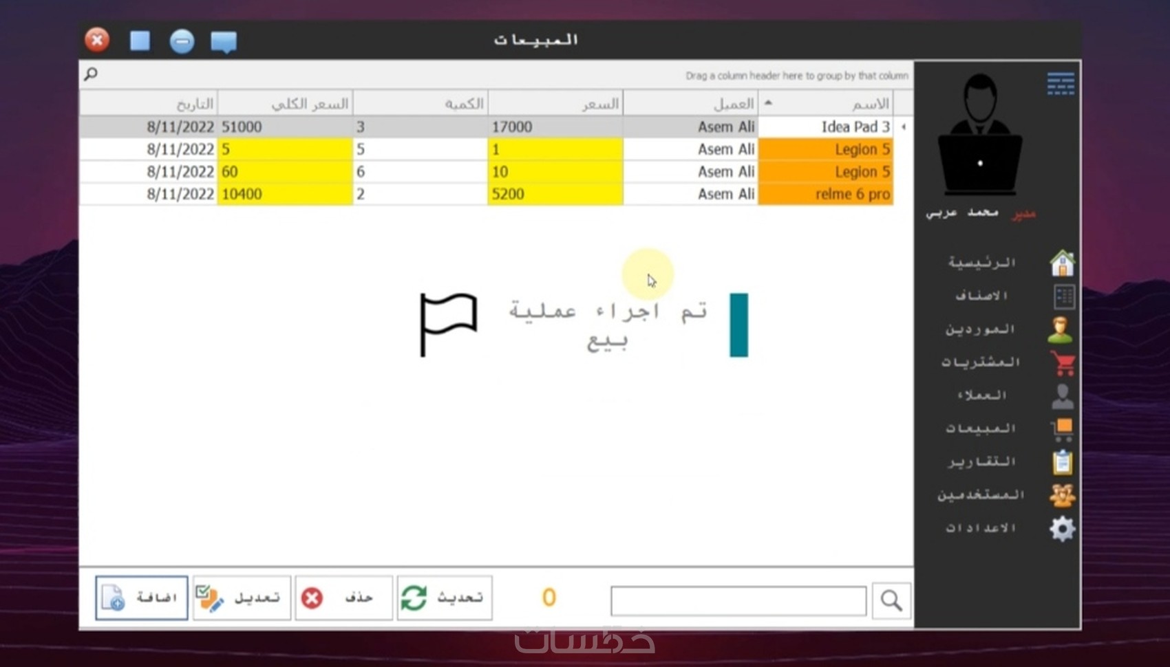 ٦- شاشة المبيعات لي اضافة عملية بيع جديدة (اختيار اسم/كود المنتج من شاشة المشتريات - اختيار اسم/اضافة عميل جديد - سعر البيع يتم الحصول عليه مباشر من شاشة المشتريات ويمكن التعديل عليه - الكمية ، في حالة الكمية غير كافية يتم إبلاغك) وعند الضغط علي اضافة عملية البيع يتم حفظ العملية في قاعدة البينات وطبع لك فاتورة للعميل وفي اعلي الصفحة سعر جميع مبيعاتك