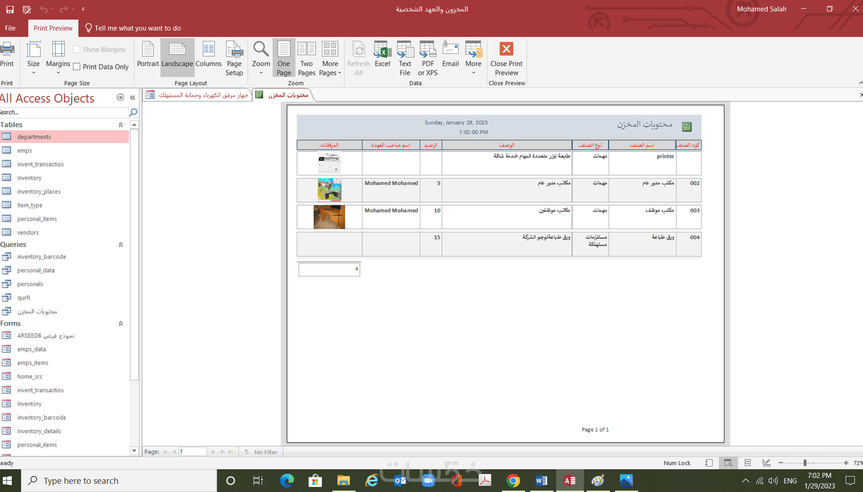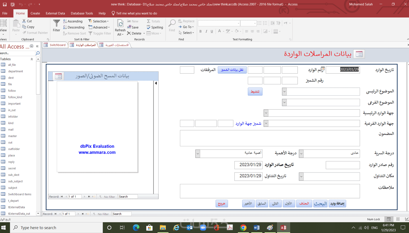 يمكنننى إنشاء وتصميم قاعدة بيانات كاملة اعتبارا من مرحلة تحليل البيانات وصولا إلى الحصول على تقارير وإحصائيات يمكن تقديمها لمتخذ القرار وتشمل إنشاء الجداول (ملفات البيانات) و نماذج الإدخال (الشاشات)و أيضا التقارير على النحو التالى: