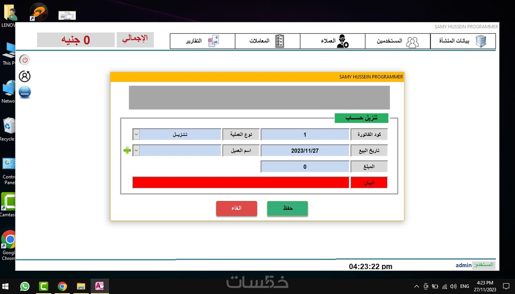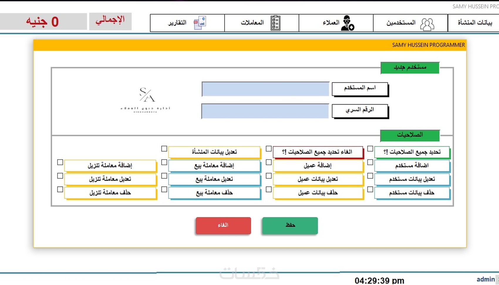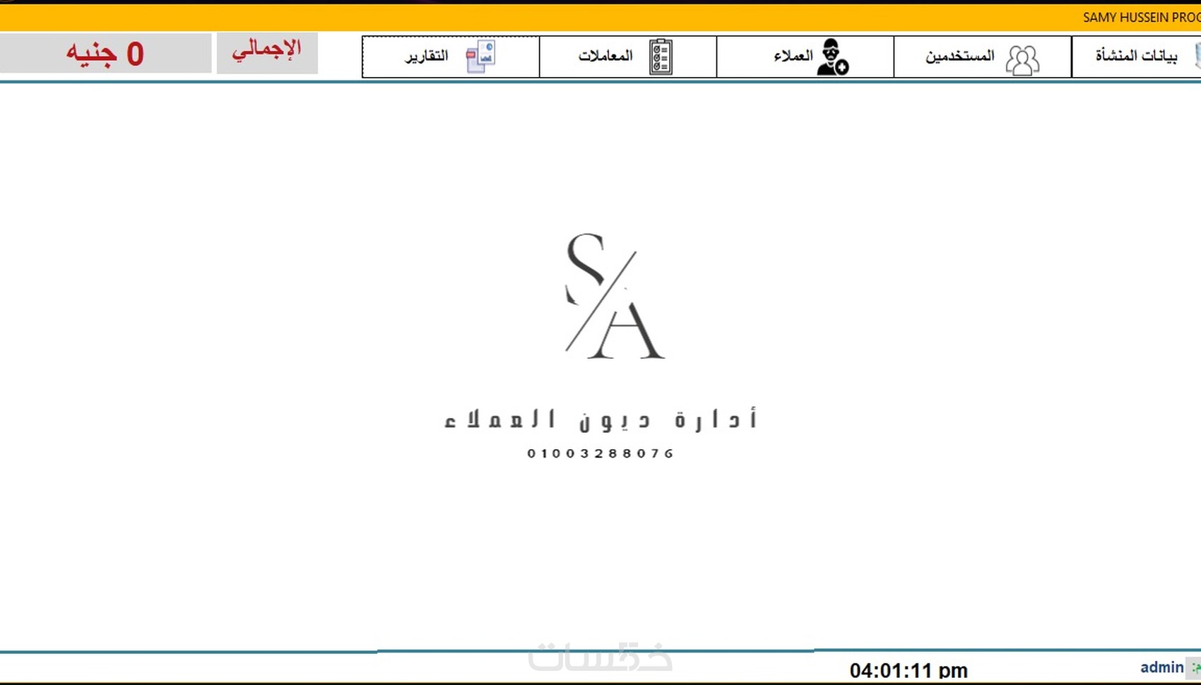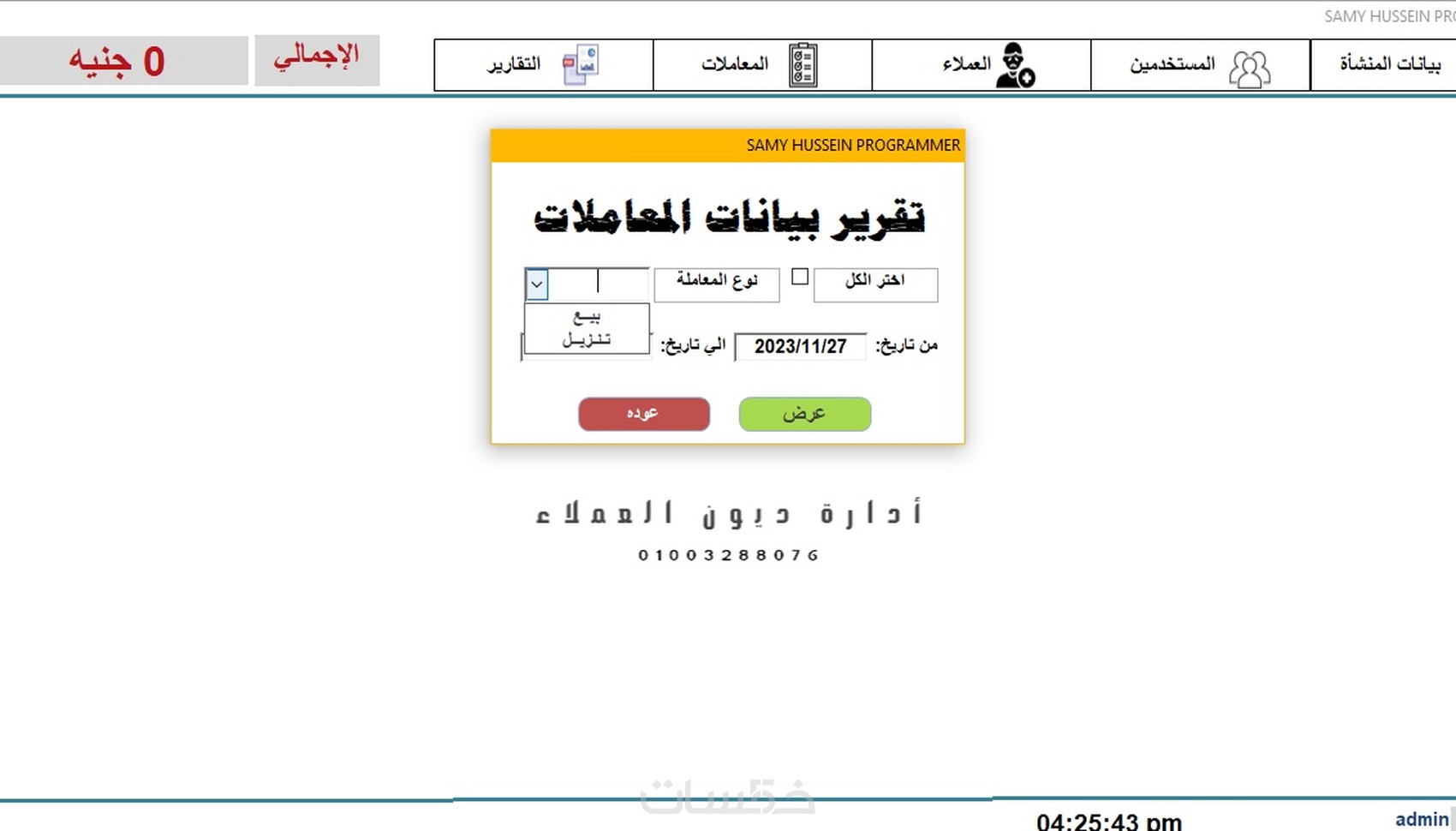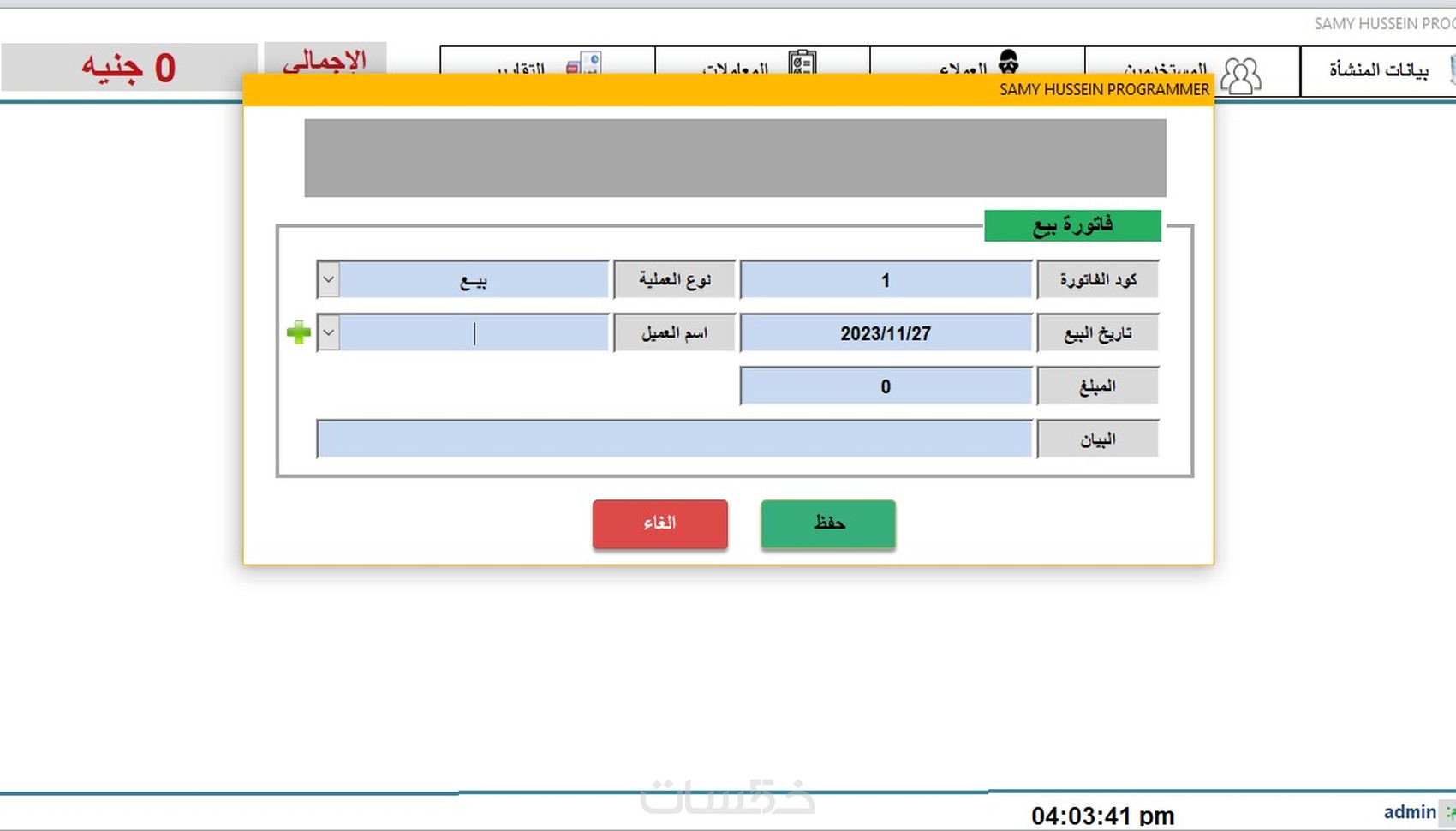 البرنامج بسيط وسهل الاستخدام، فهو يتيح إدارة مريحة لمعاملاتك المالية مع العملاء من خلال حفظ تفاصيل كل معاملة. تسجيل أسماء العملاء فاتورة بيع تزيل تقارير جميع المعاملات