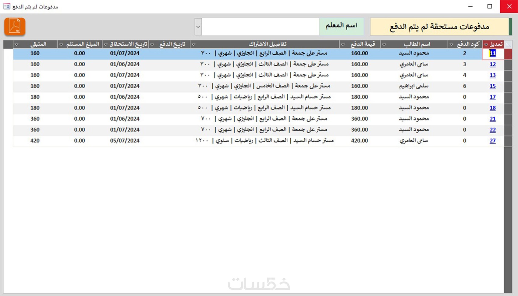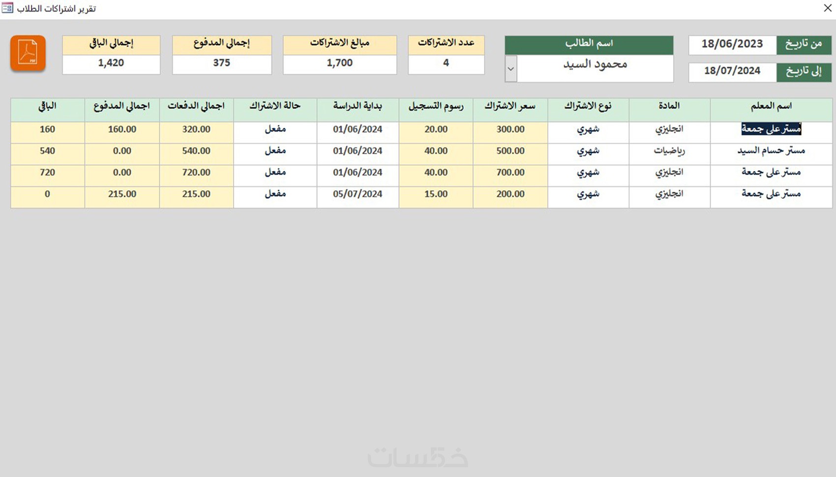 6- تقارير شاملة وتفصيلية عن الارباح المصروفة للمعلمين وعن الطلاب الموجودين مع كل معلم