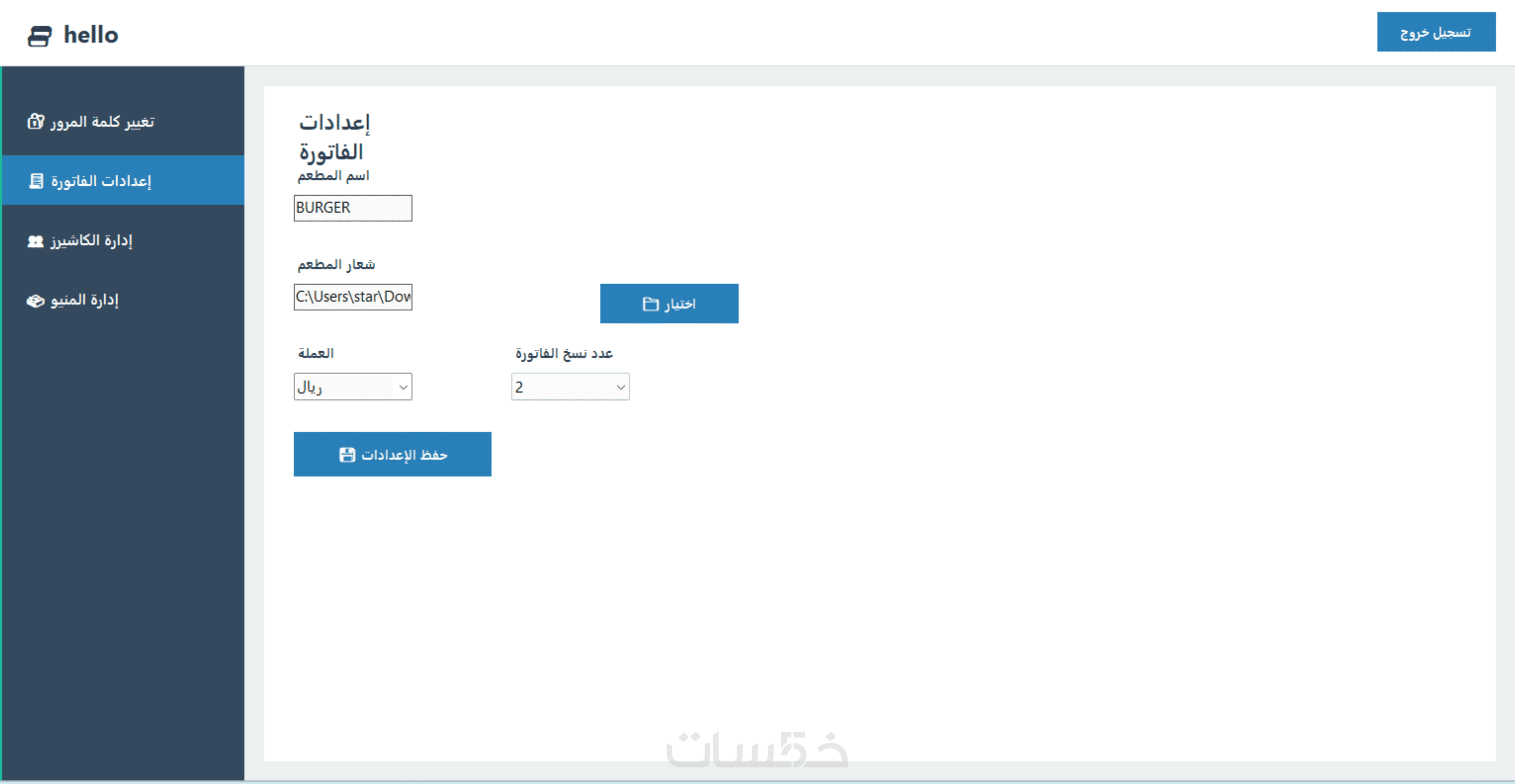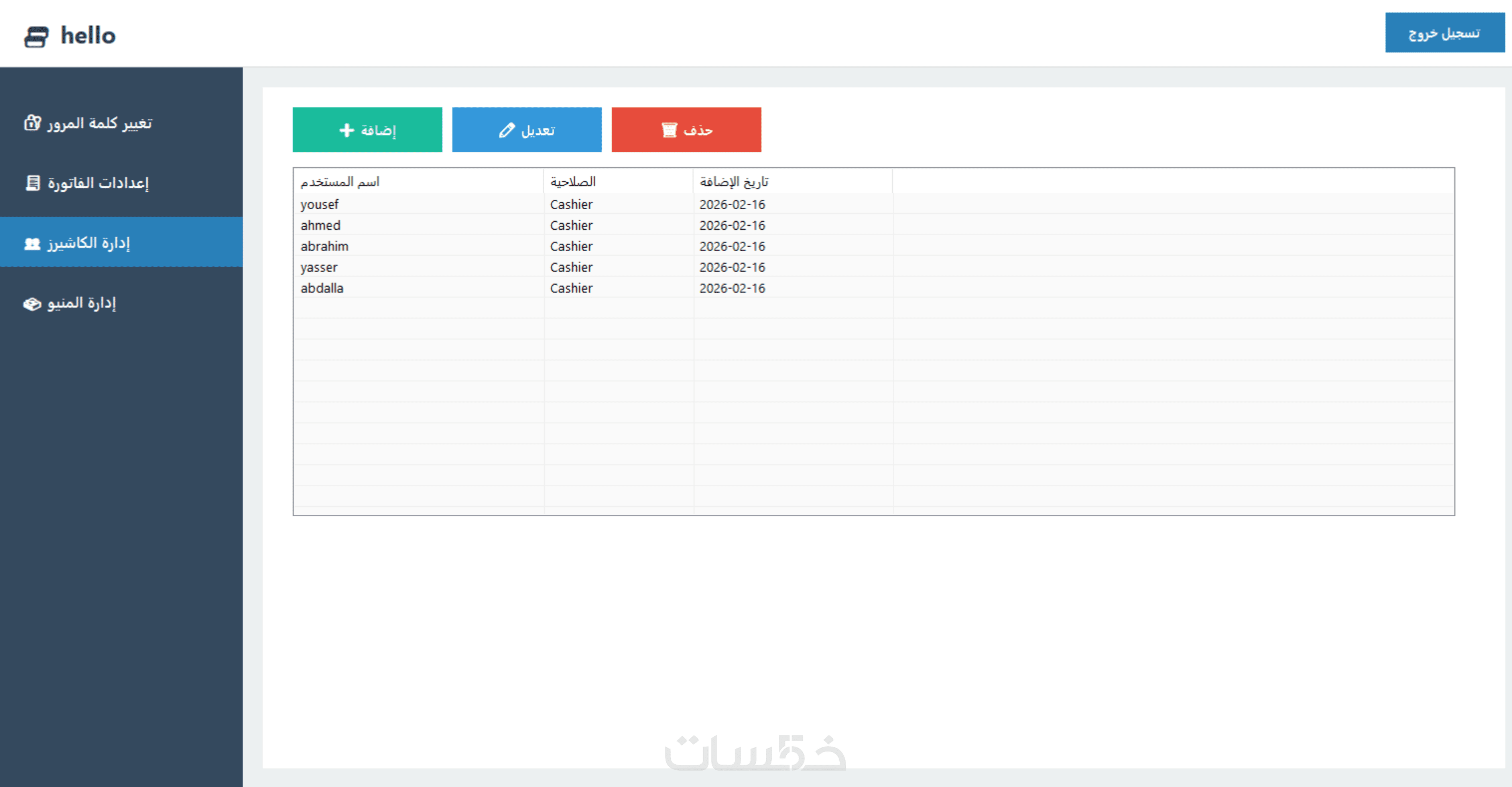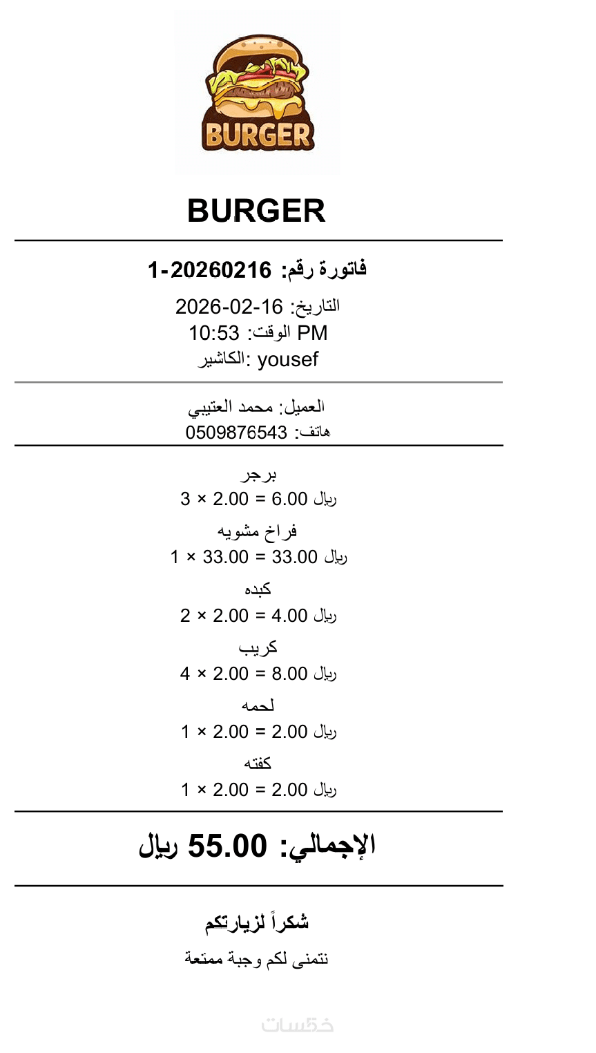 صفحة Admin لإضافة وتعديل وحذف العناصر والفئات بالصور، إدارة الكاشيرز، وتخصيص الفاتورة باسم المطعم والشعار وعدد النسخ.