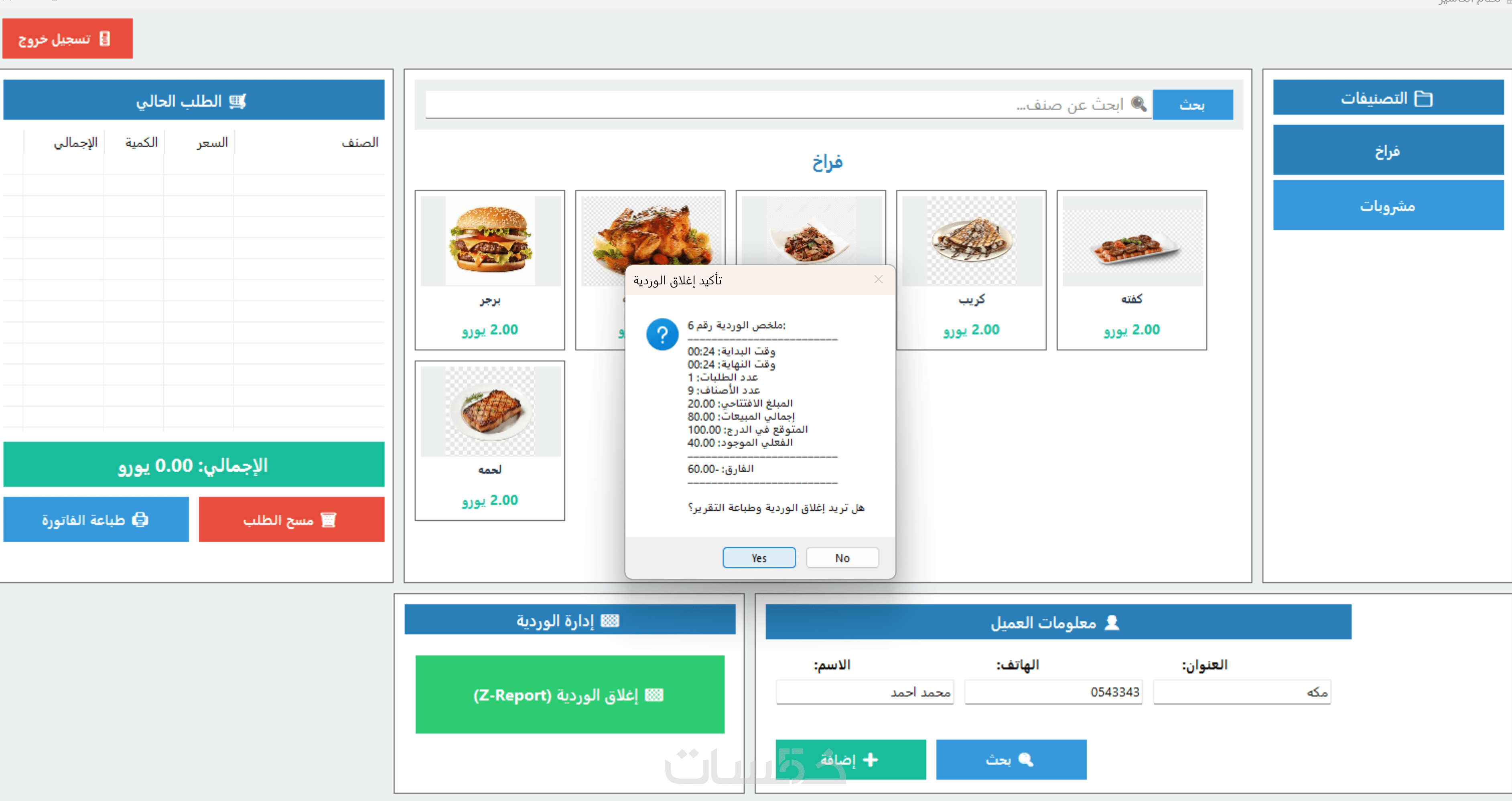 واجهة الكاشير تعرض المنيو من العناصر والفئات، وتدعم إضافة العملاء، البحث عنهم، إدخال الطلبات، وطباعة الفواتير بسهولة. يتضمن زر تقفيل العهدة اليومية لعرض إجمالي المبيعات والمبلغ الكلي