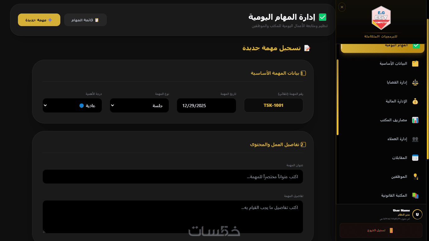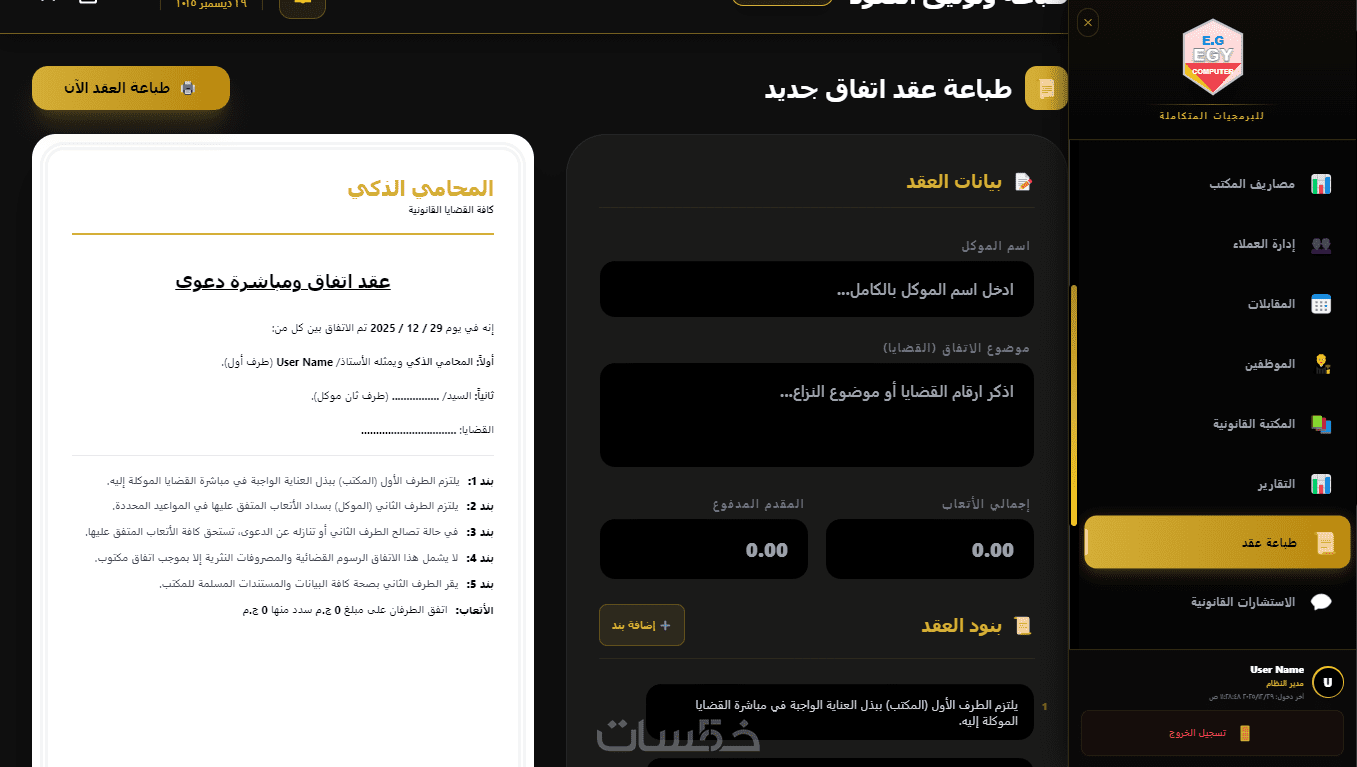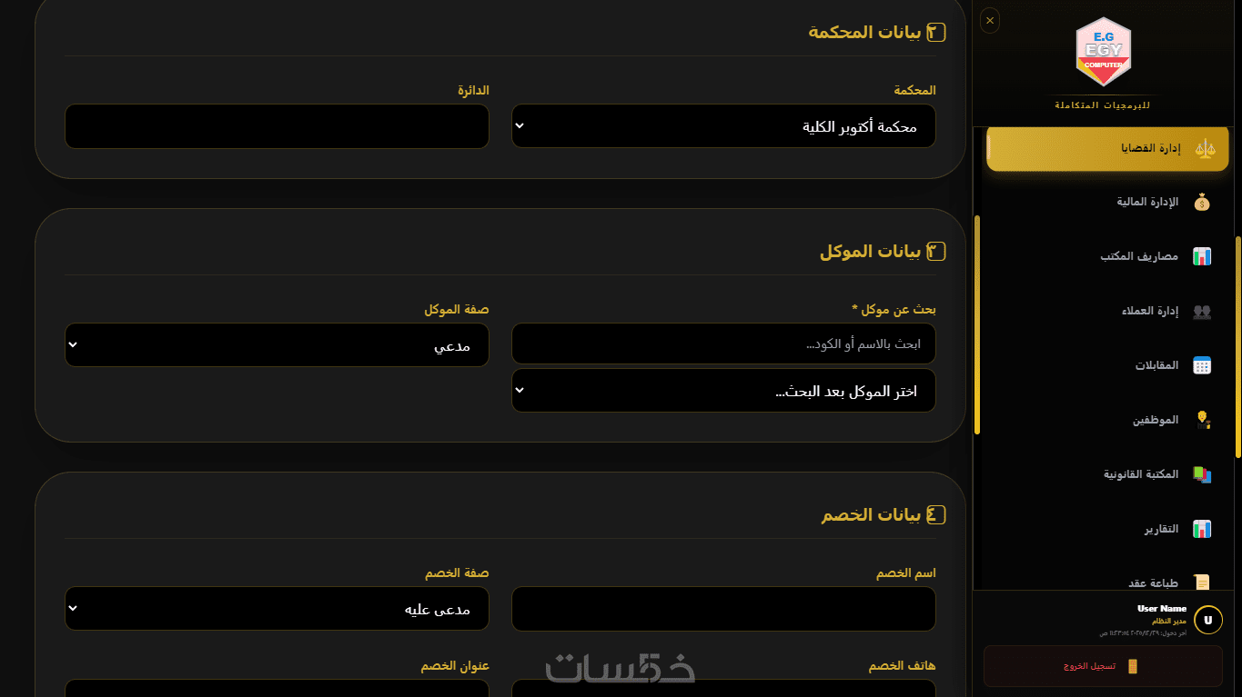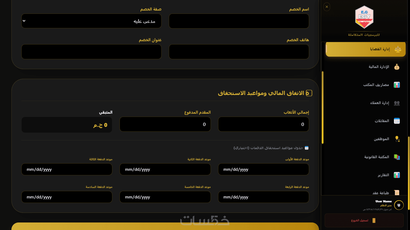 يحتوي على نظام مالي متكامل لإدارة الأتعاب، المدفوعات، والفواتير، مع تقارير مالية دقيقة توضح أداء المكتب والأرباح المحققة لكل قضية أو عميل.