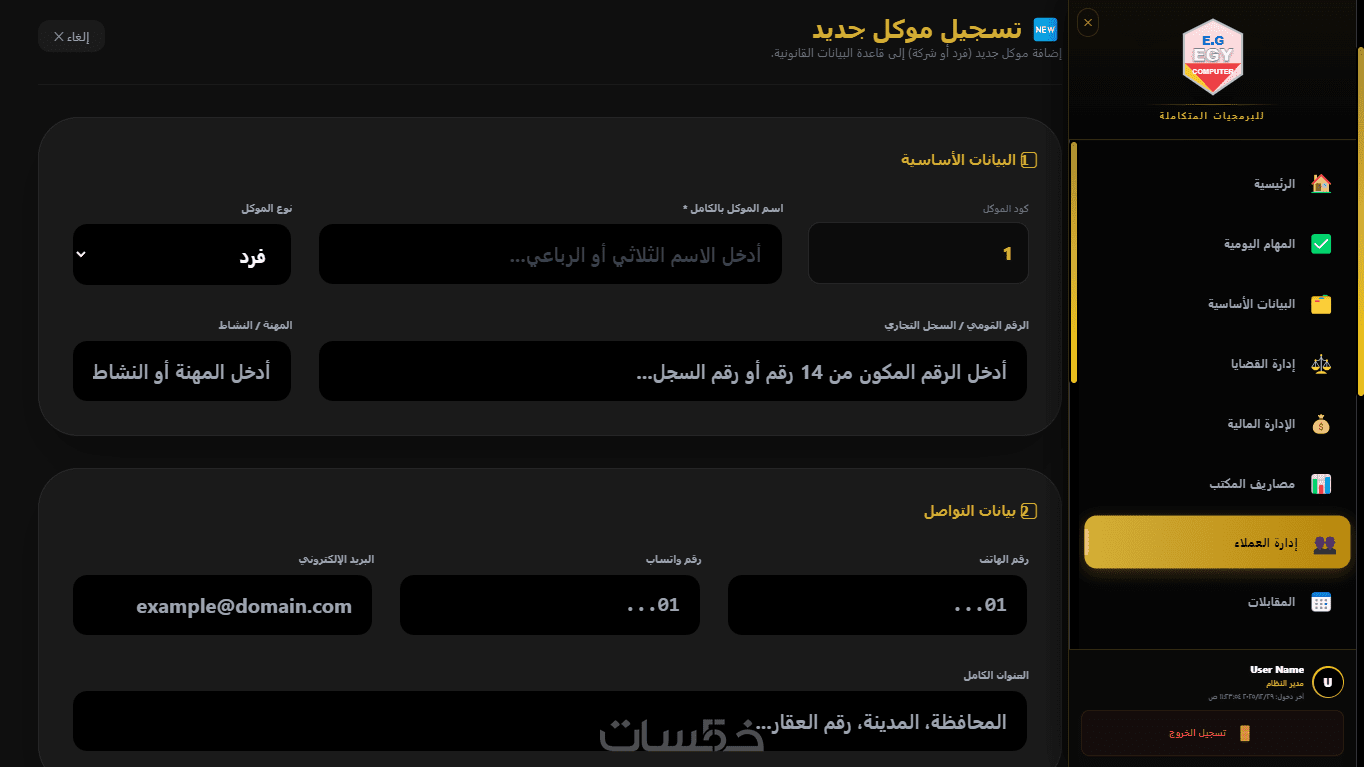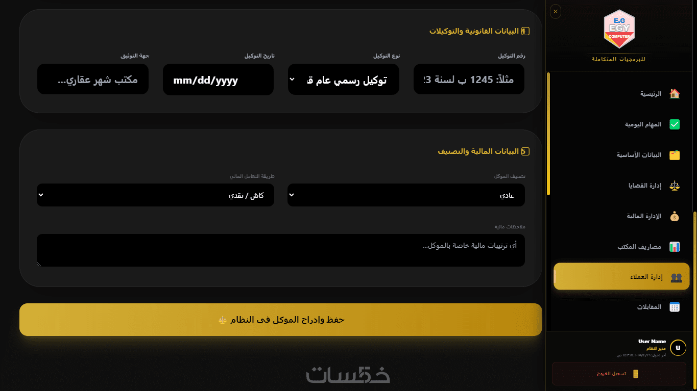 يسمح بإدارة العملاء بطريقة احترافية من خلال قاعدة بيانات شاملة تحتوي على بيانات التواصل، العقود، والمستندات القانونية الخاصة بكل عميل، مما يسهل الوصول إلى المعلومات في أي وقت.