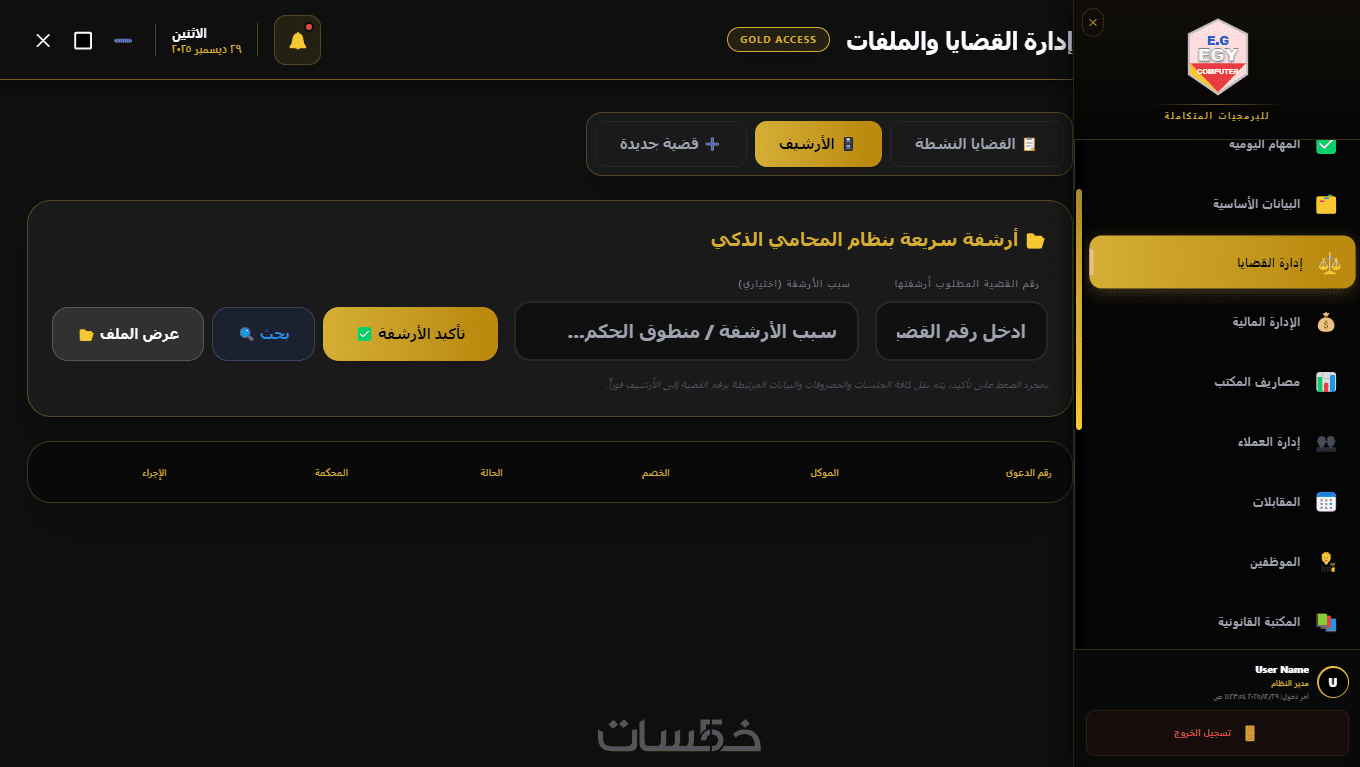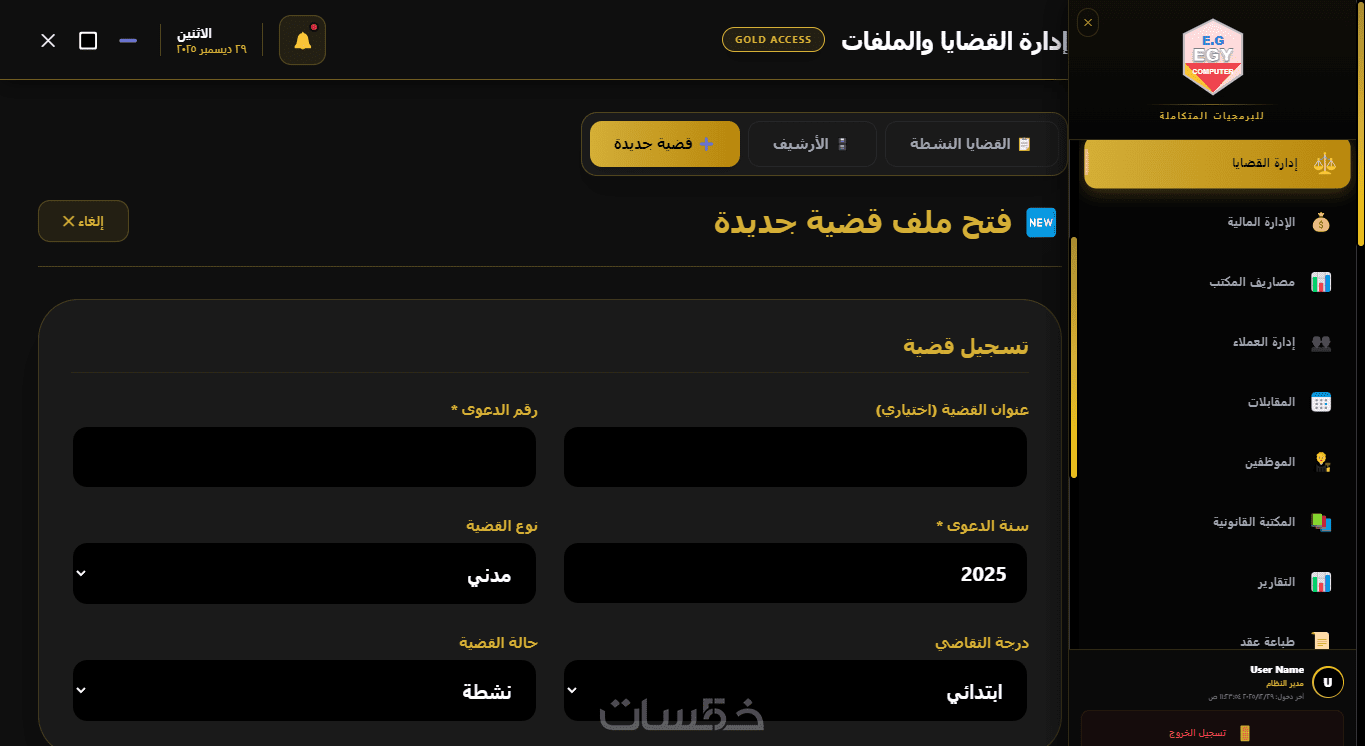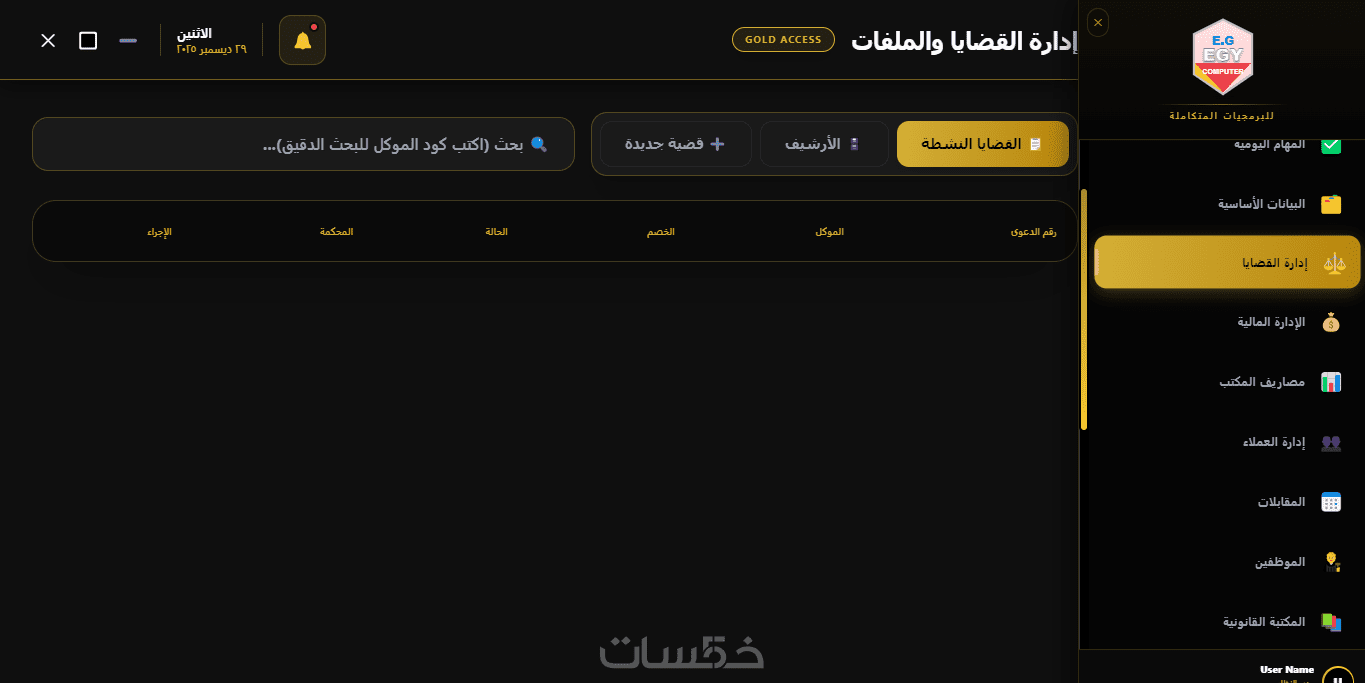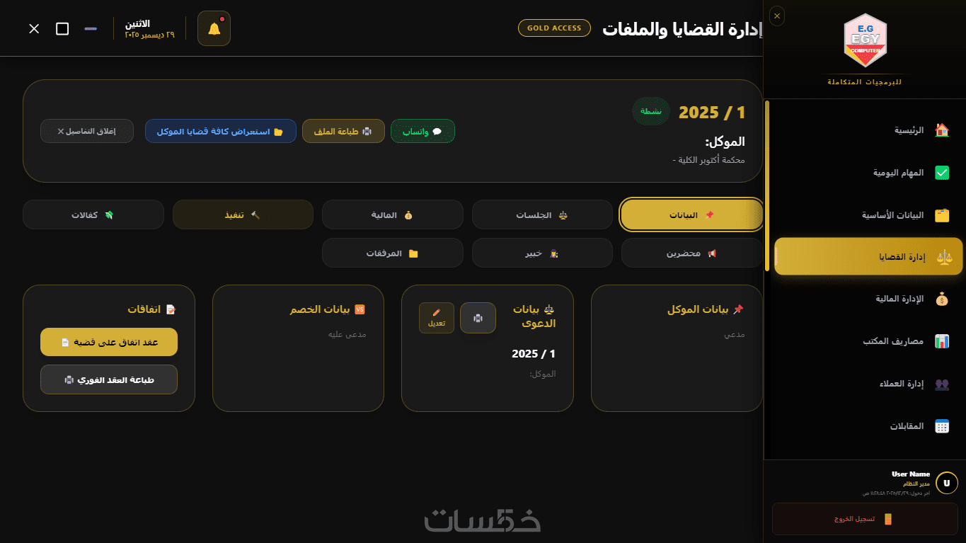 يوفر البرنامج نظامًا متكاملًا لإدارة القضايا من البداية حتى صدور الحكم، مع إمكانية تسجيل تفاصيل كل قضية، مواعيد الجلسات، والمحاكم المعنية، بالإضافة إلى متابعة حالة كل ملف بشكل فوري ومنظم.