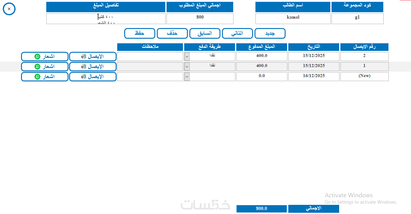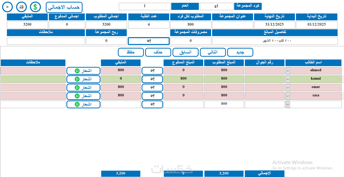 اذا كان لديك مركز للدروس او الكورسات او تقدم خدمات تدريبية ومحتاج لاداة تساعدك في تنظيم مجموعاتك وتسجيل ايراداتك ومصروفاتك ويكون لديك تقارير سريعة تعطيك بيانات كاملة وتذكرك بالمتدربين الذين لم يسددوا ويرسل لهم رسايل واتس اب تذكرهم بالدفع لذلك ستحتاج بالتاكيد برنامج يساعدك. اقدم لك برنامج من تصميمي ستجد فيه كل ذلك واكثر