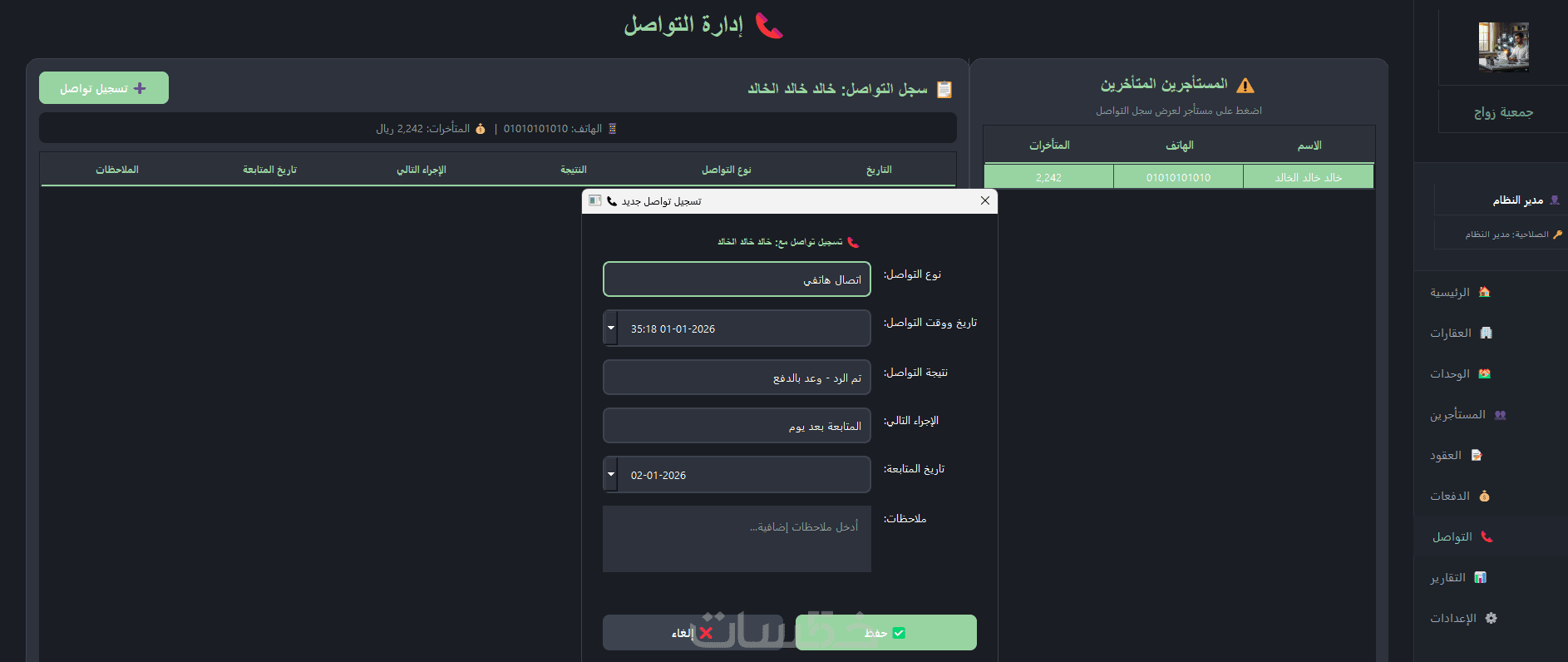 سجل تواصل متكامل: تتبع عمليات التواصل مع المستأجرين المتأخرين لضمان حقوقك المالية.