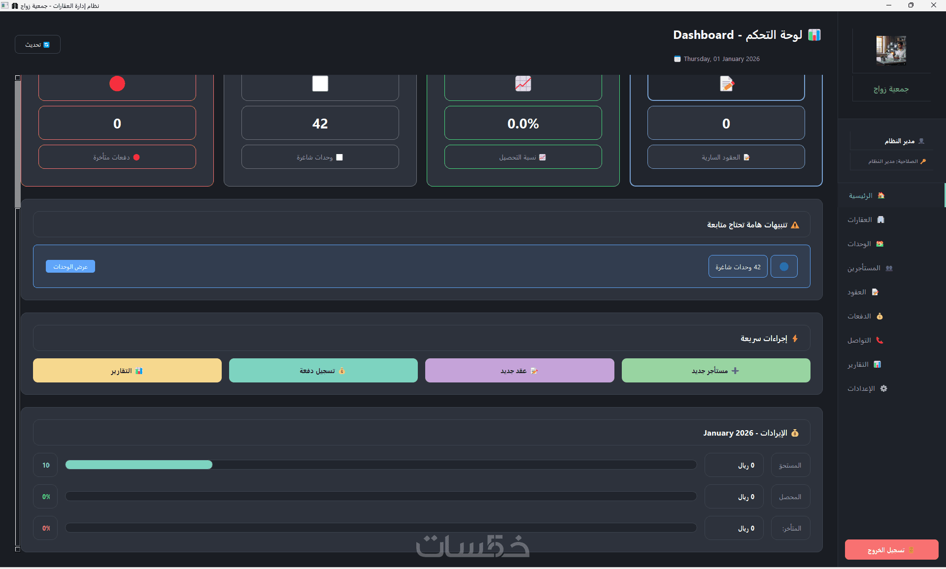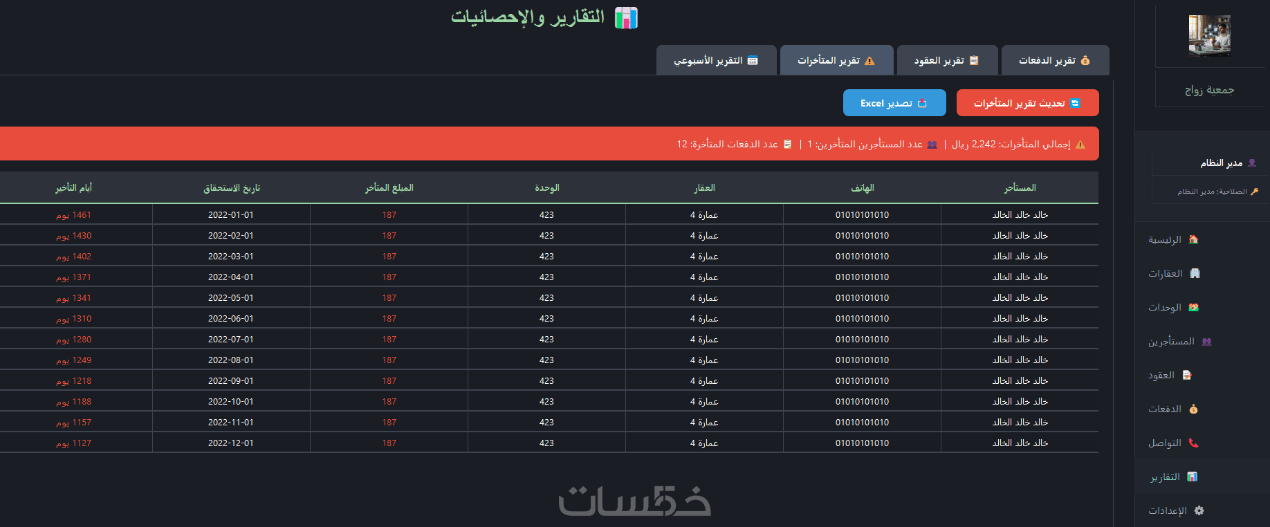 وداعاً للأخطاء الحسابية؛ تتبع الإيرادات الشهرية، نسب التحصيل، والدفعات المتأخرة بدقة متناهية وبالعملة المحلية (ر.س).