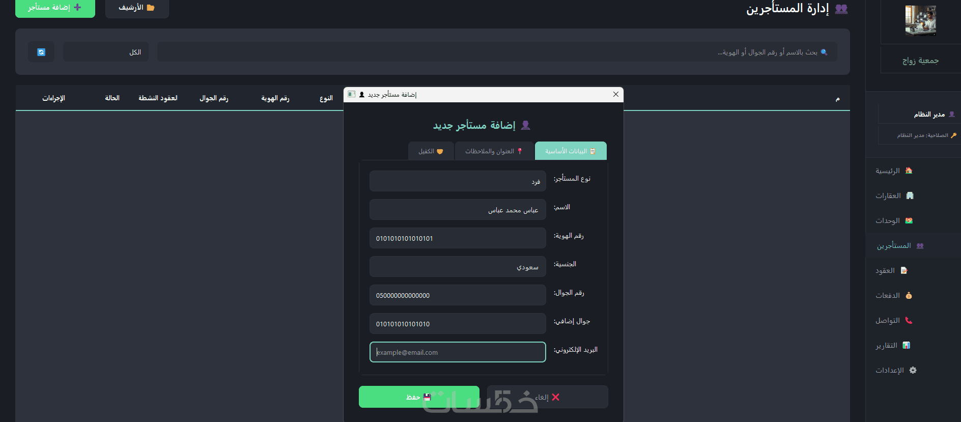 إدارة بيانات المستأجرين (أفراد ومؤسسات) مع نظام أرشفة متكامل وتتبع دقيق للعقود السارية والمنتهية.