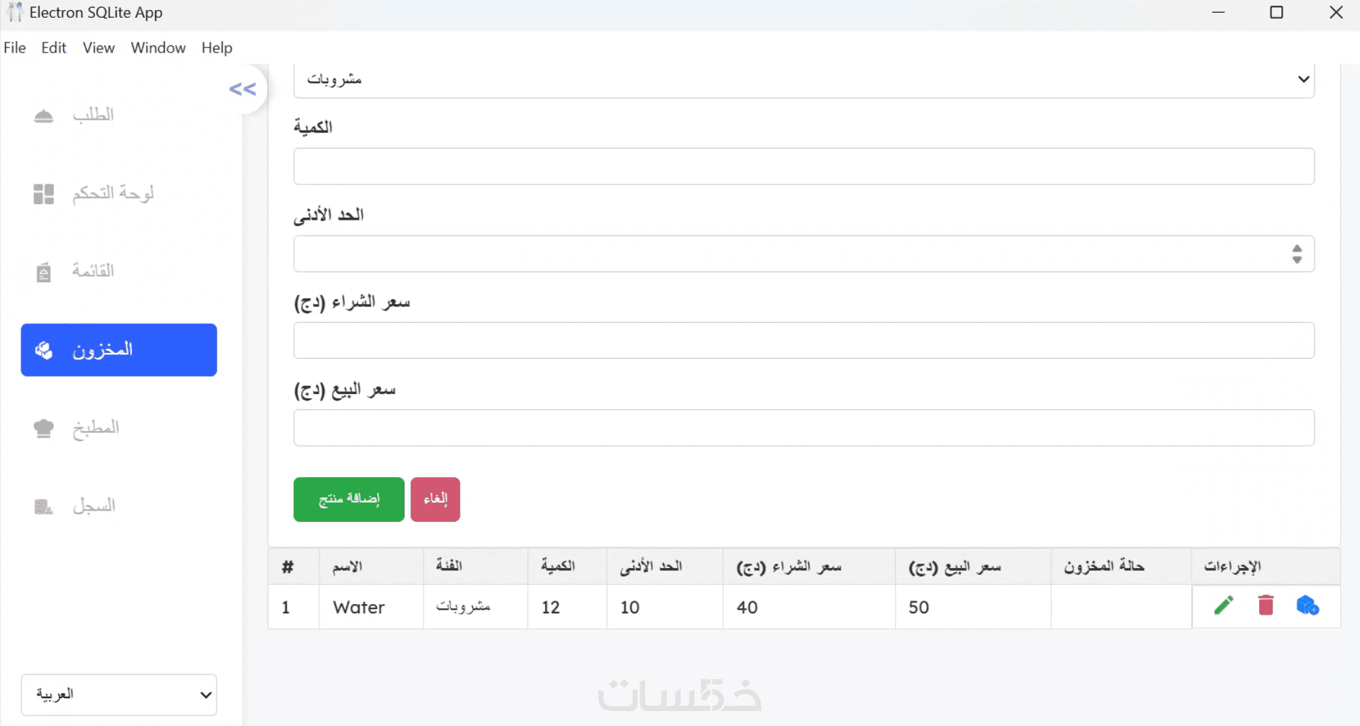 شاشة إدارة المخزون : لمتابعة كميات المواد الخام المتوفرة وتحديثها يدوياً لضمان عدم نفاد المكونات الأساسية.