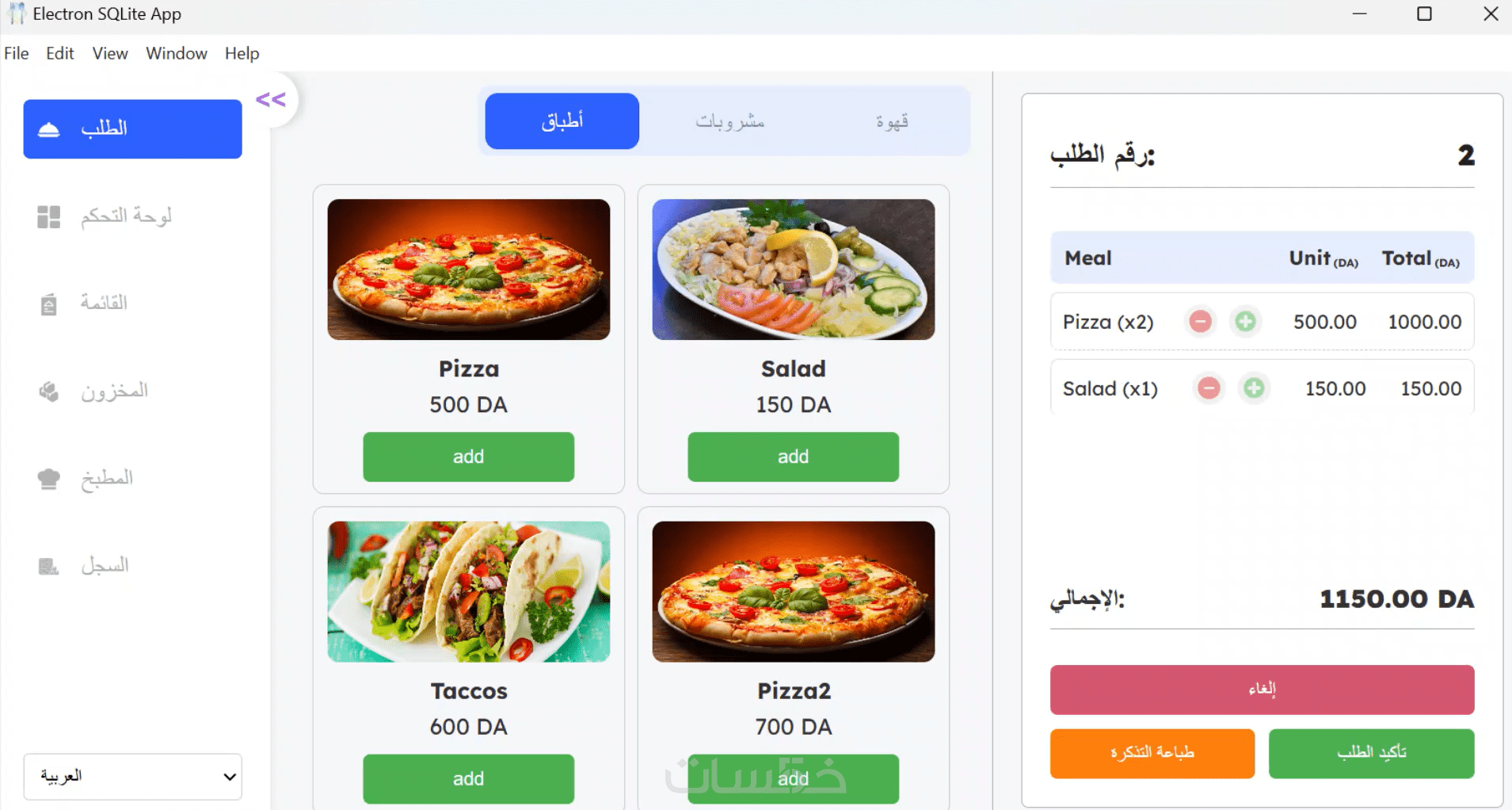 نظام كاشير (POS): واجهة سريعة لإضافة الطلبات وطباعة الوصولات.