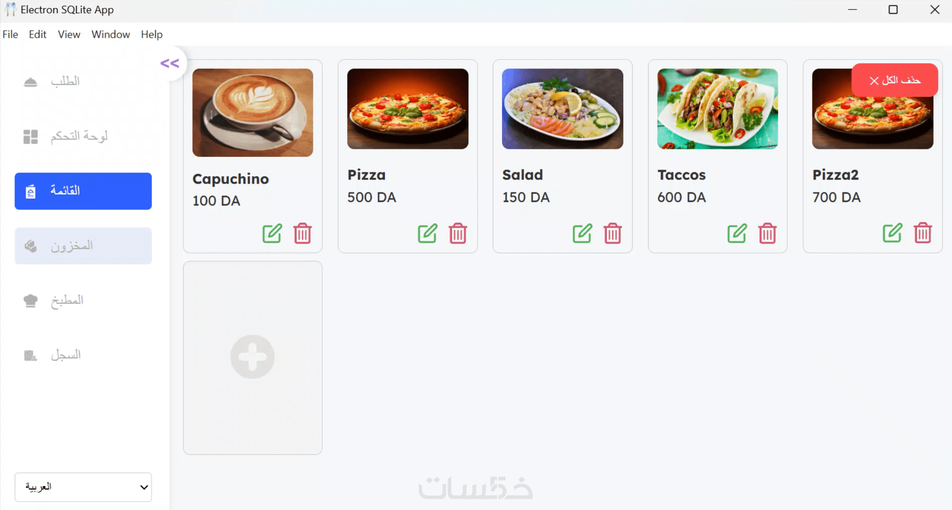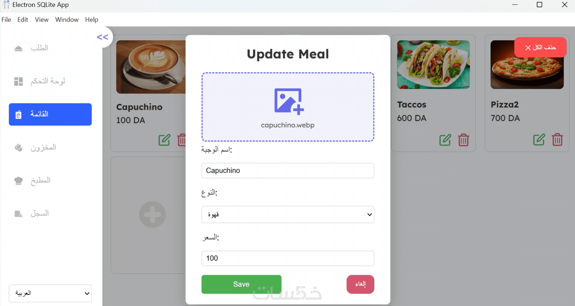 شاشة إدارة القائمة : تتيح إضافة وجبات جديدة، تصنيفها (أطباق رئيسية، مشروبات، حلويات)، وتحديد الأسعار والصور.