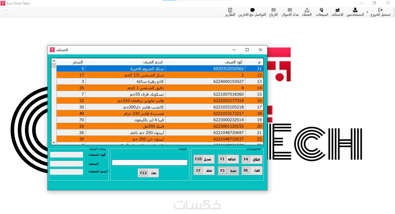 قاعدة بيانات شاملة للأصناف تشمل (كود الصنف، الاسم، والسعر) مع سهولة البحث والتعديل . يوجد داخل قاعده البيانات 6339 صنف من أصناف السوبر ماركت