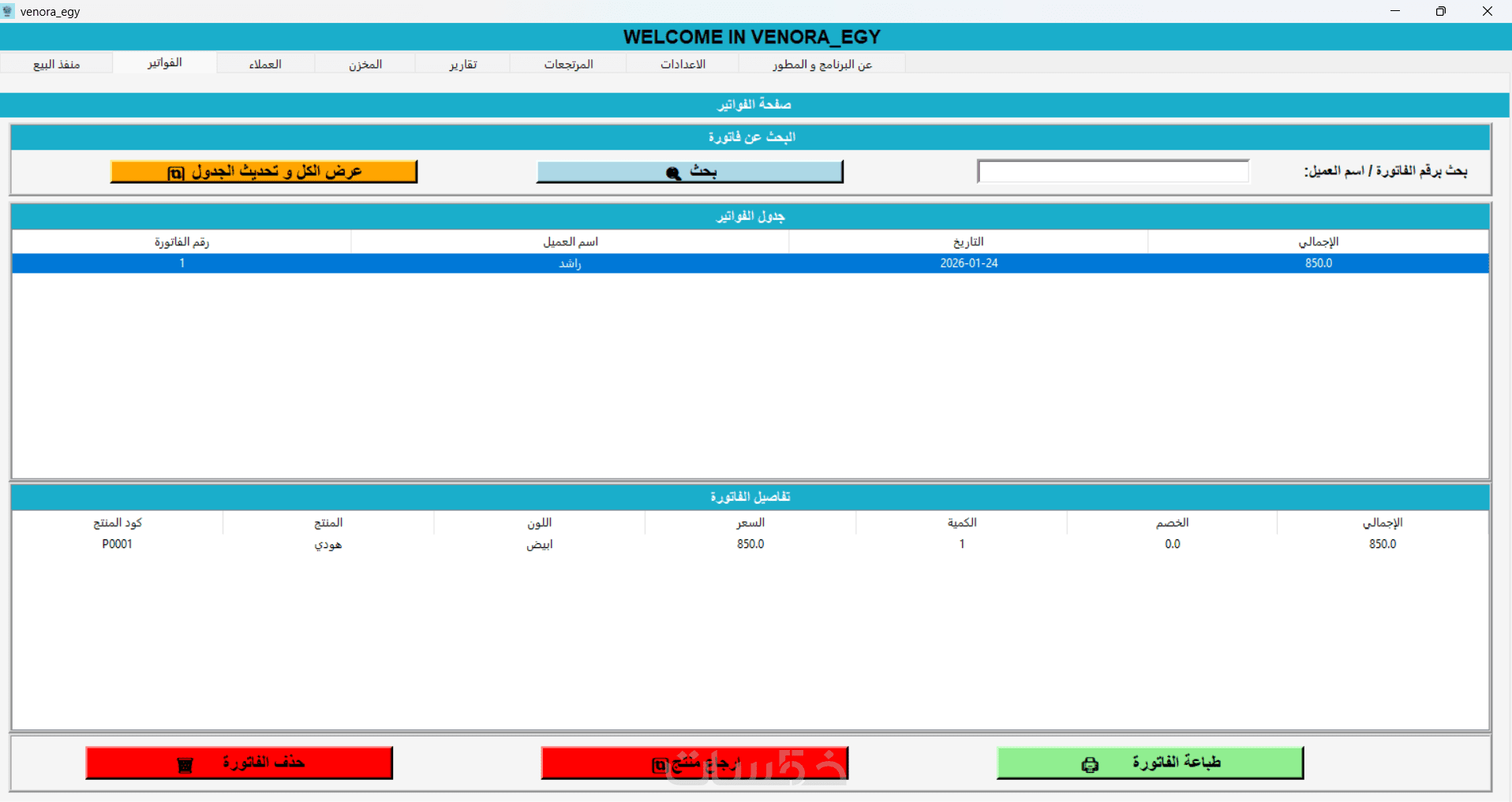 طباعة الفاتورة حراريًا أو حفظها PDF.