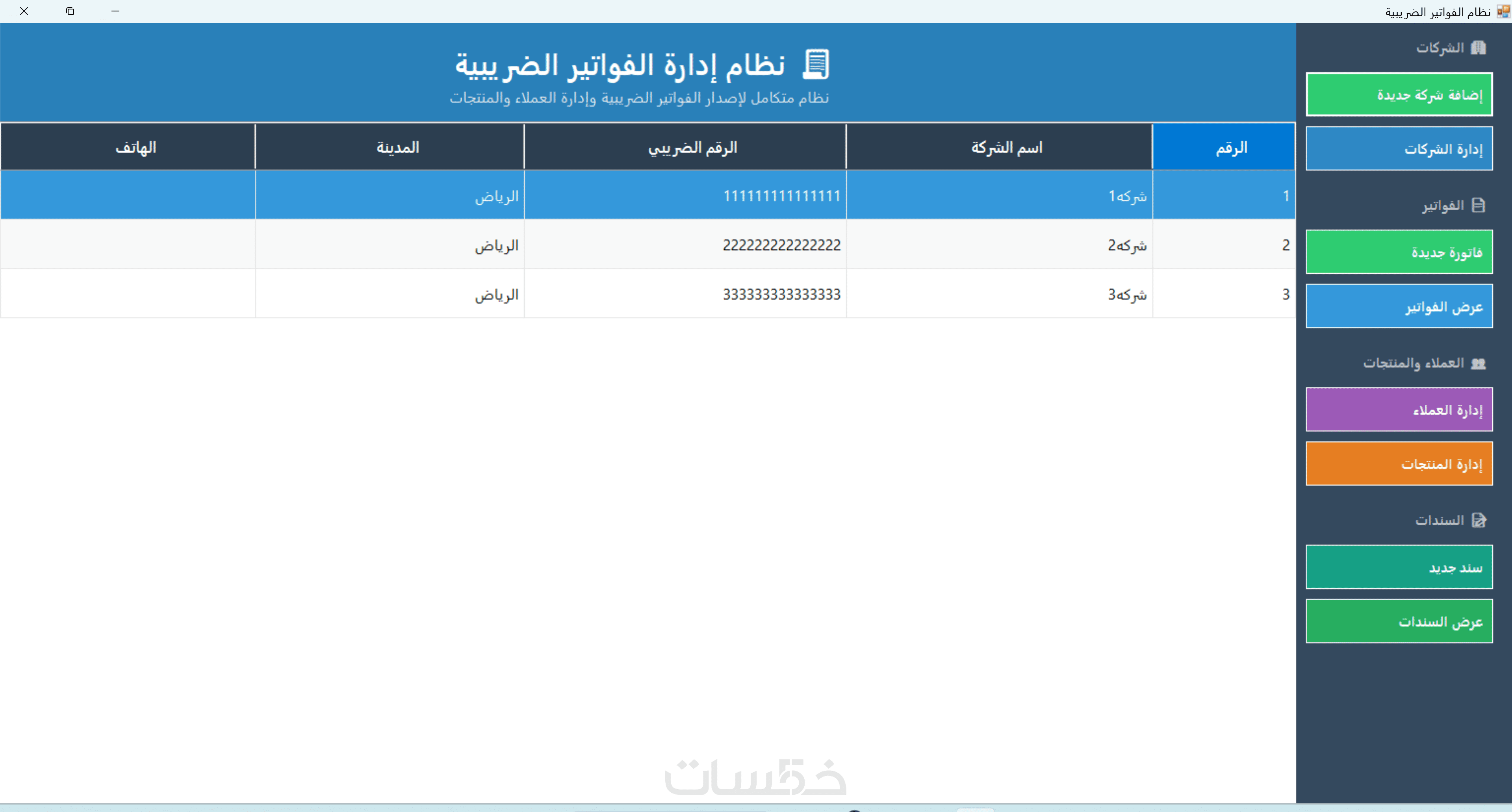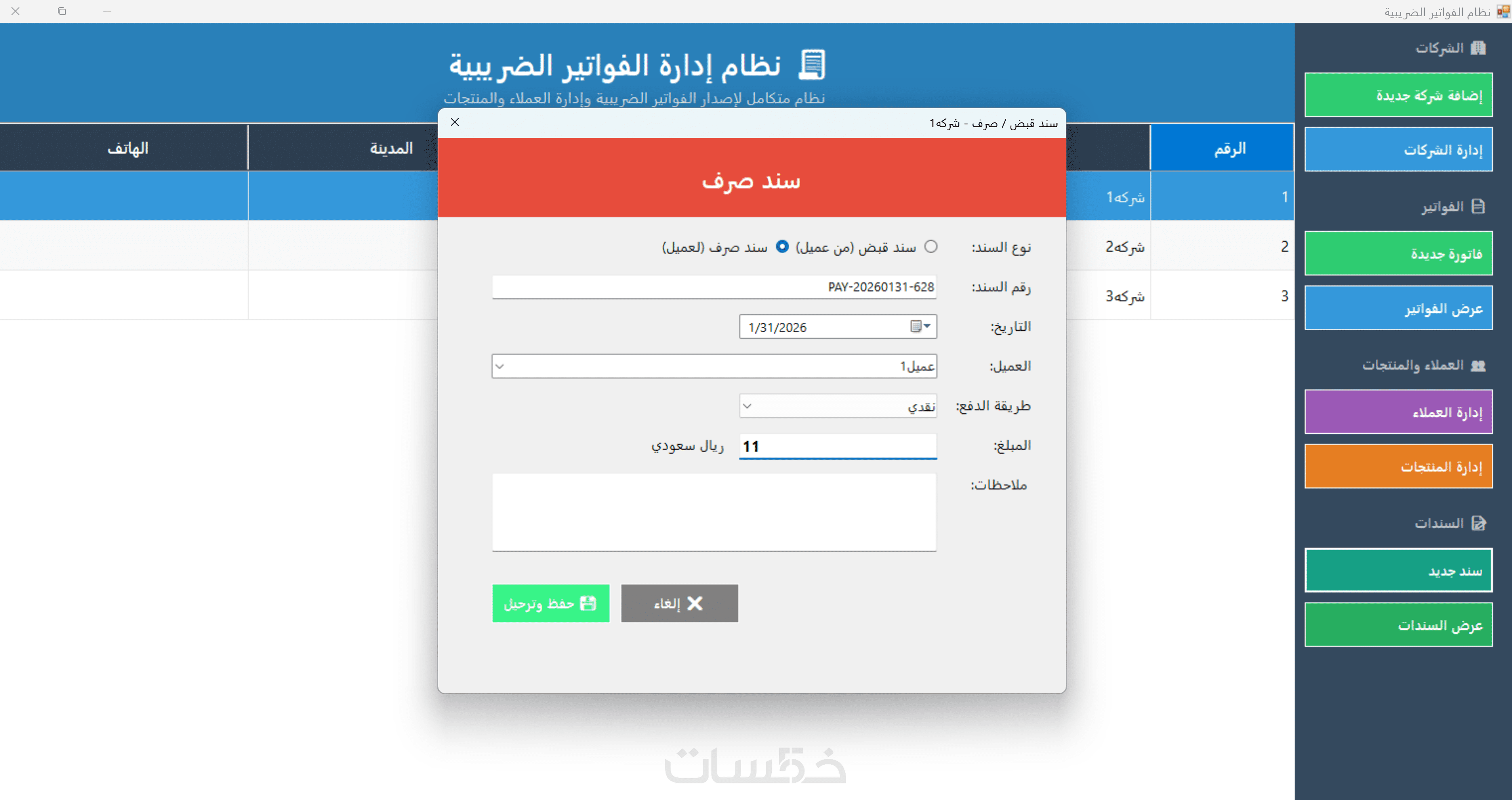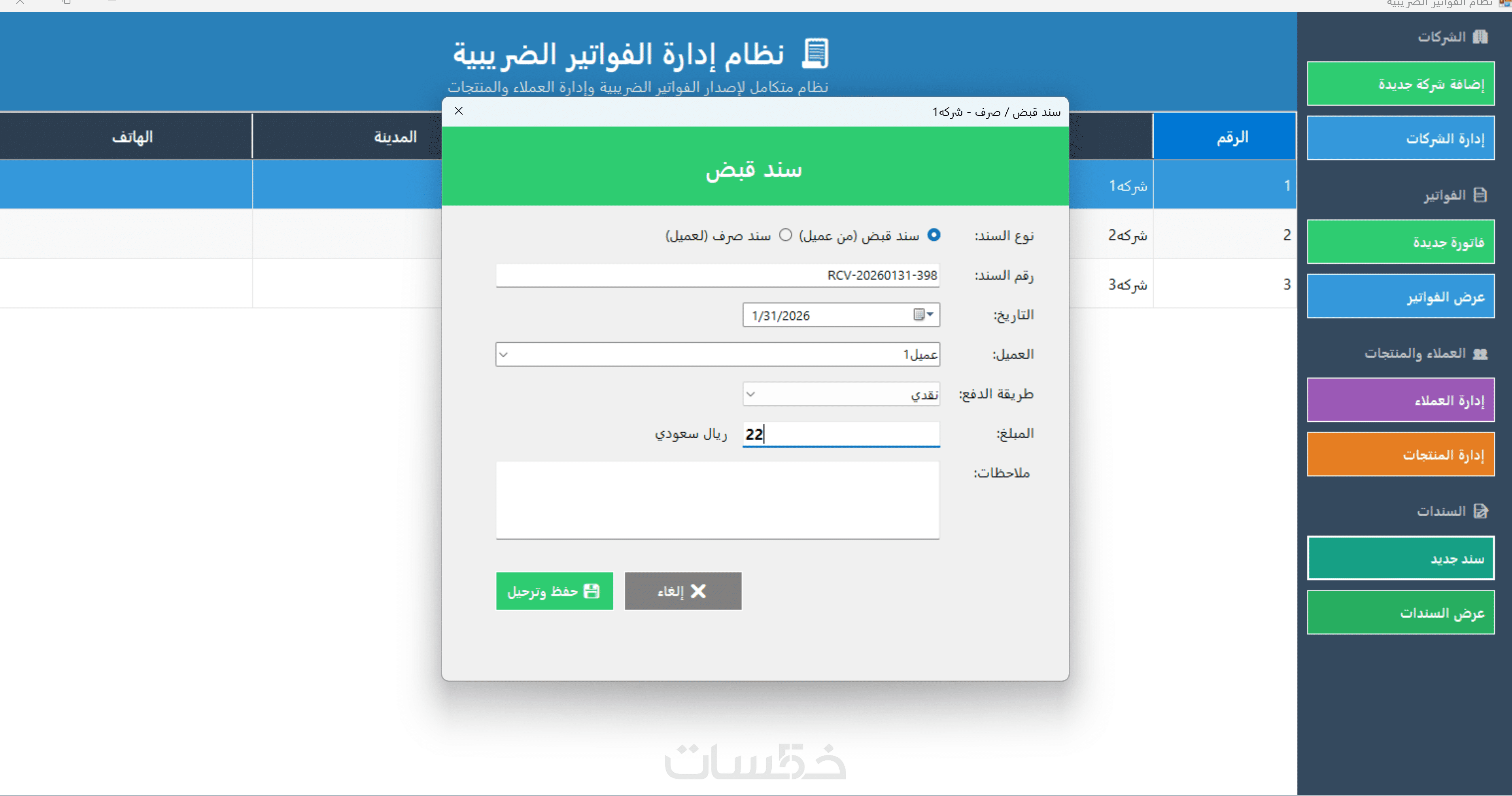 ن نظاماً محاسبياً متطوراً يتيح إدارة أكثر من شركة، مع إمكانية تعديل الفواتير بسهولة، مصمّم لدعم المنشآت في المرحلة الأولى من متطلبات هيئة الزكاة يركّز على تنظيم المبيعات والعملاء والحسابات المالية بدقة، مع الالتزام بالأساسيات النظامية، .فواتير ضريبيه متوافقة مع المرحلة الأولى