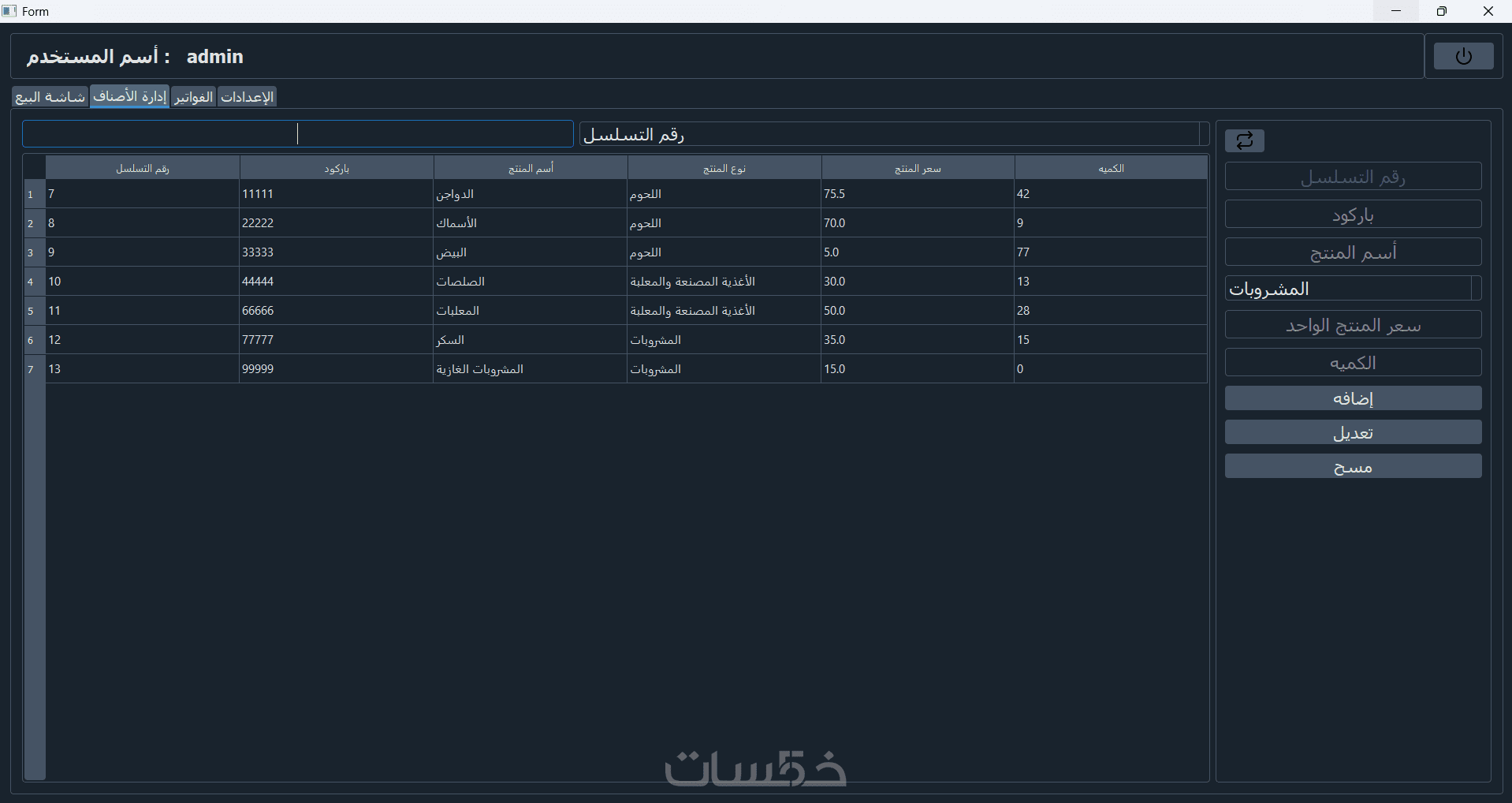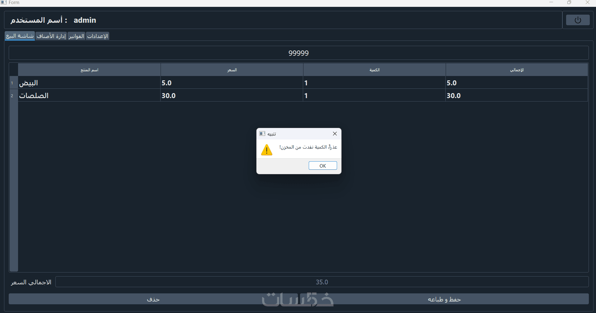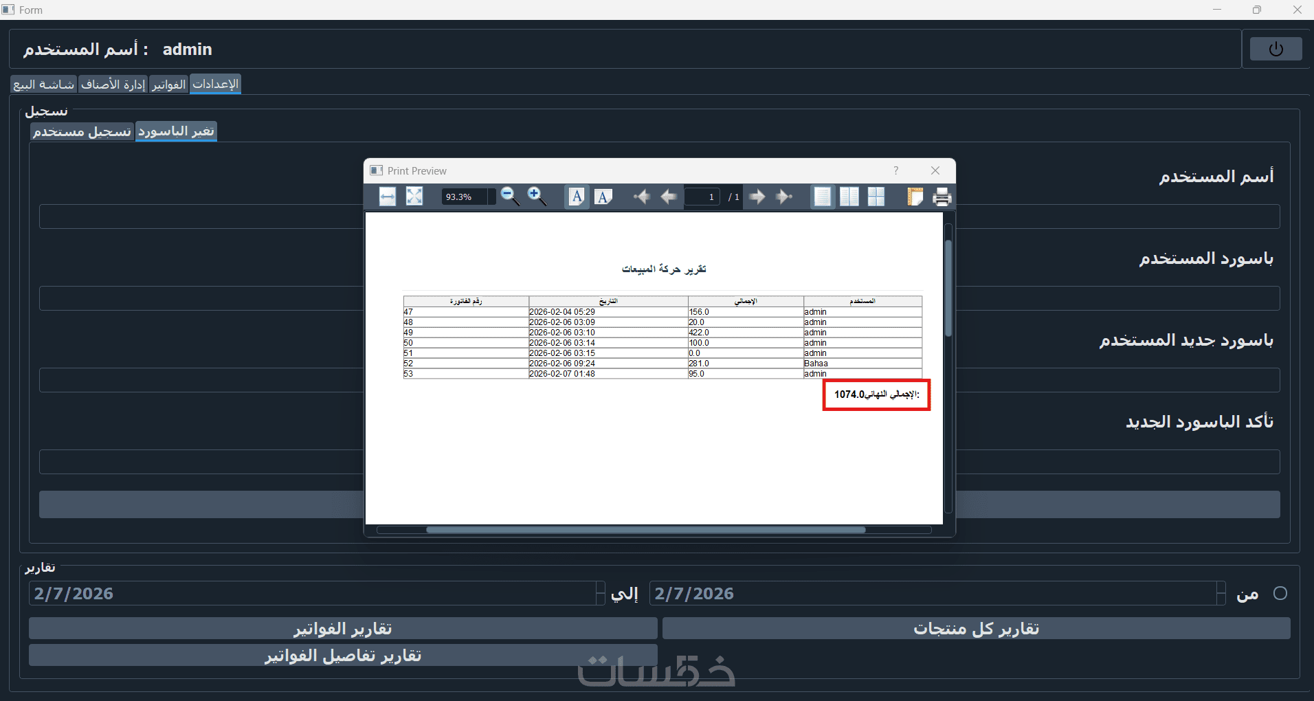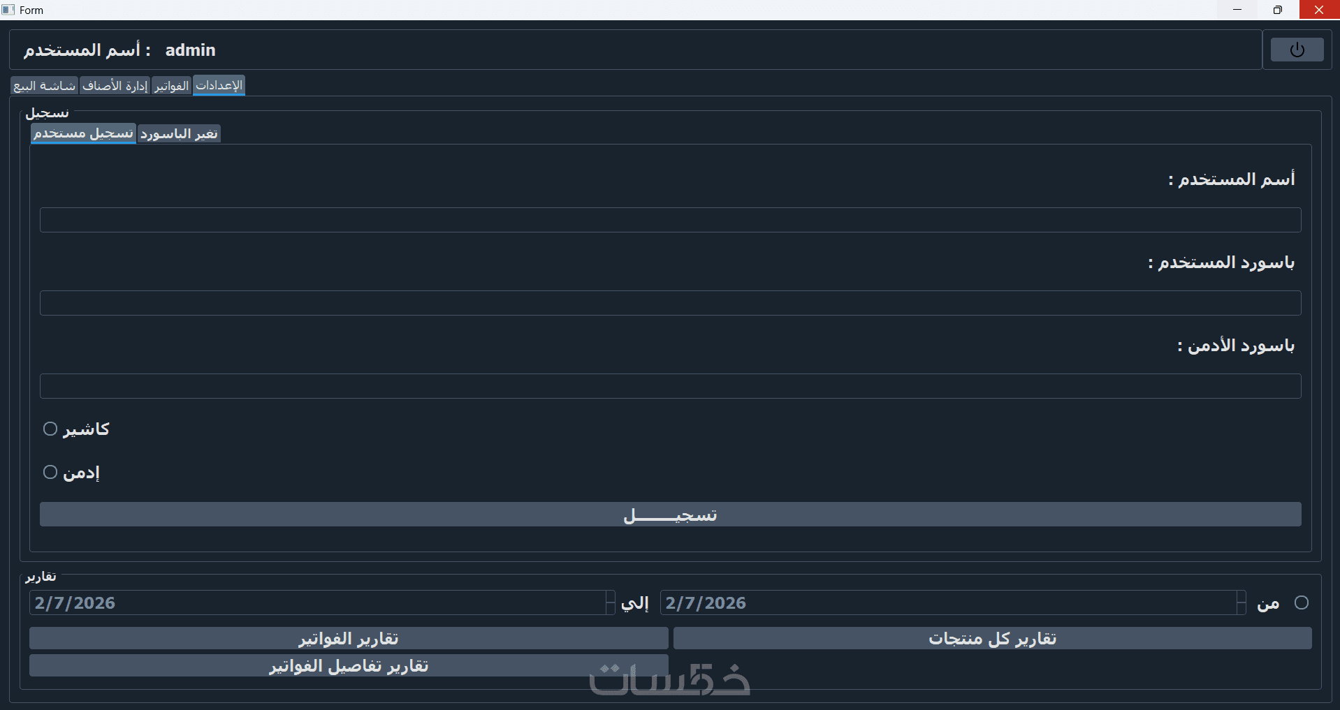 نظام صلاحيات (مدير/كاشير) مع إمكانية تغيير كلمة السر وعمل نسخ احتياطي.