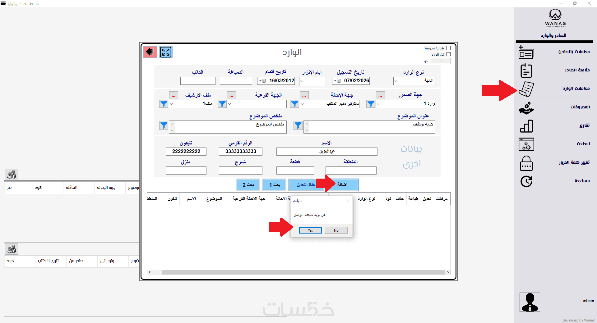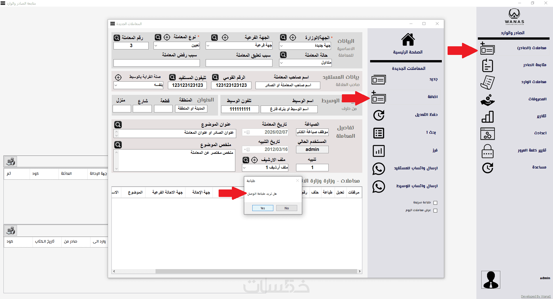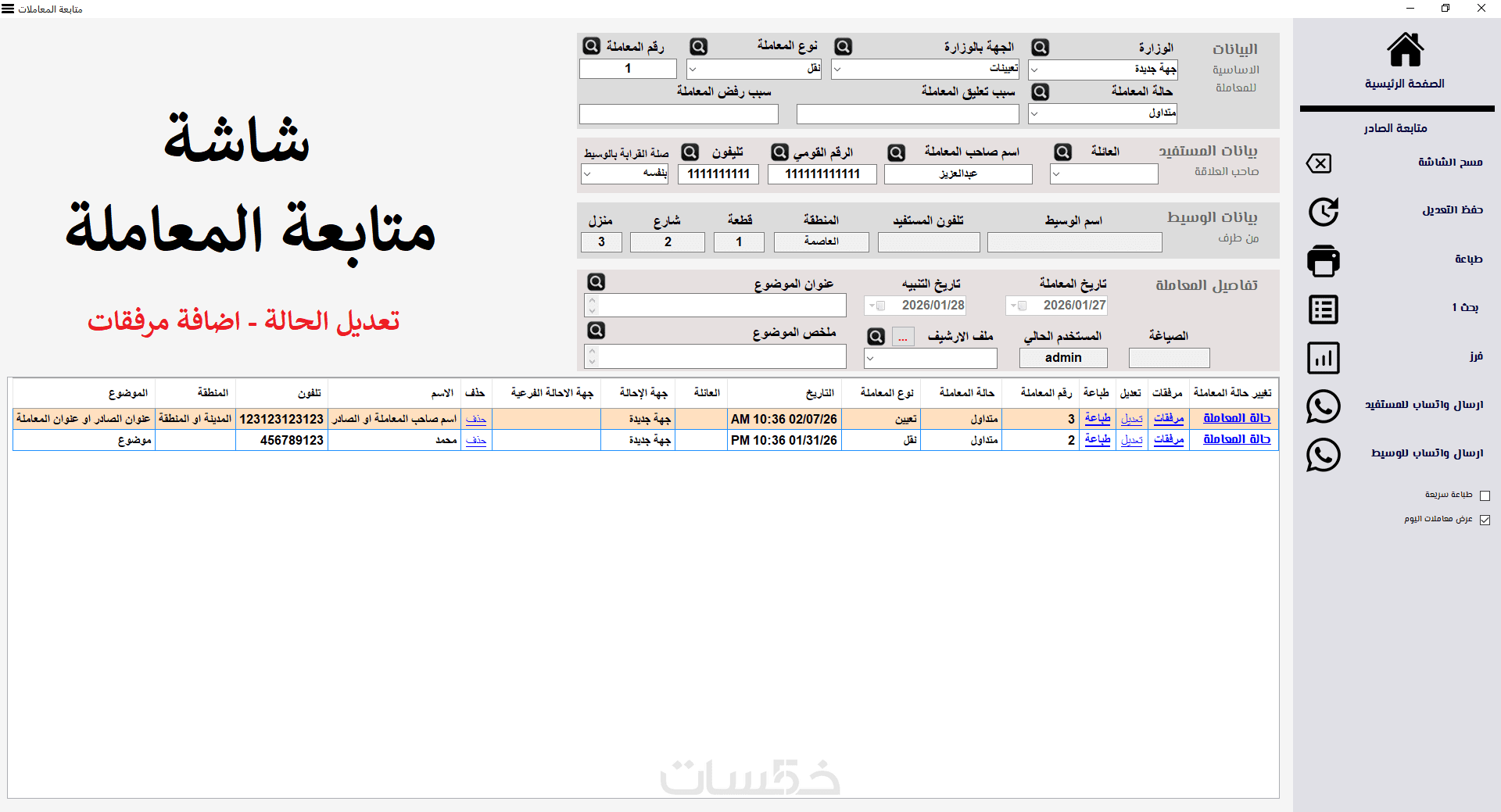 إدخال بيانات كل معاملة (رقم/تاريخ/نوع: صادر أو وارد/موضوع المعاملة/الجهة المرسلة أو المستلمة/حالة المعاملة…)، مع إمكانية إضافة ملاحظات وتحديث الحالة خطوة بخطوة.