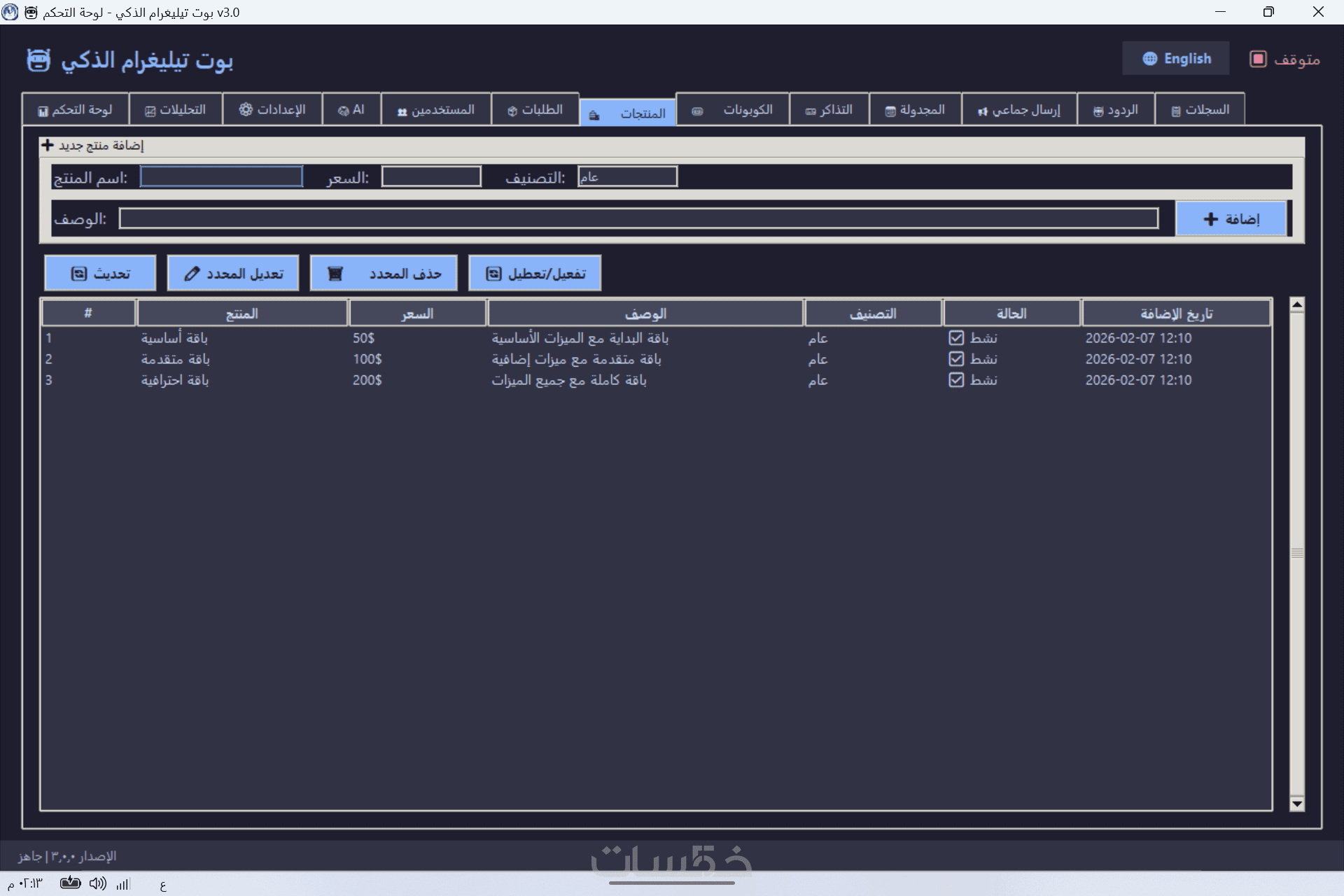 برنامج بوت تليجرام احترافي متكامل لإدارة أعمالك ومبيعاتك مع واجهة سطح مكتب كاملة